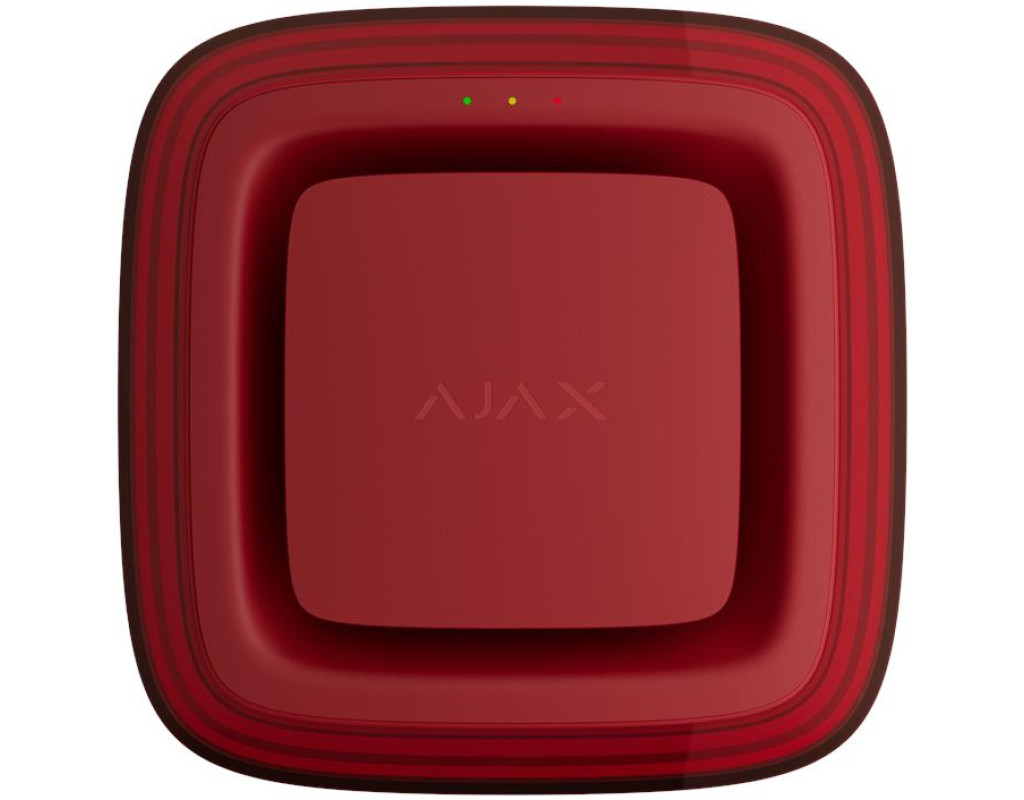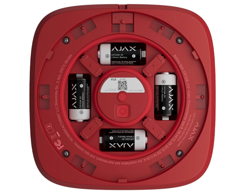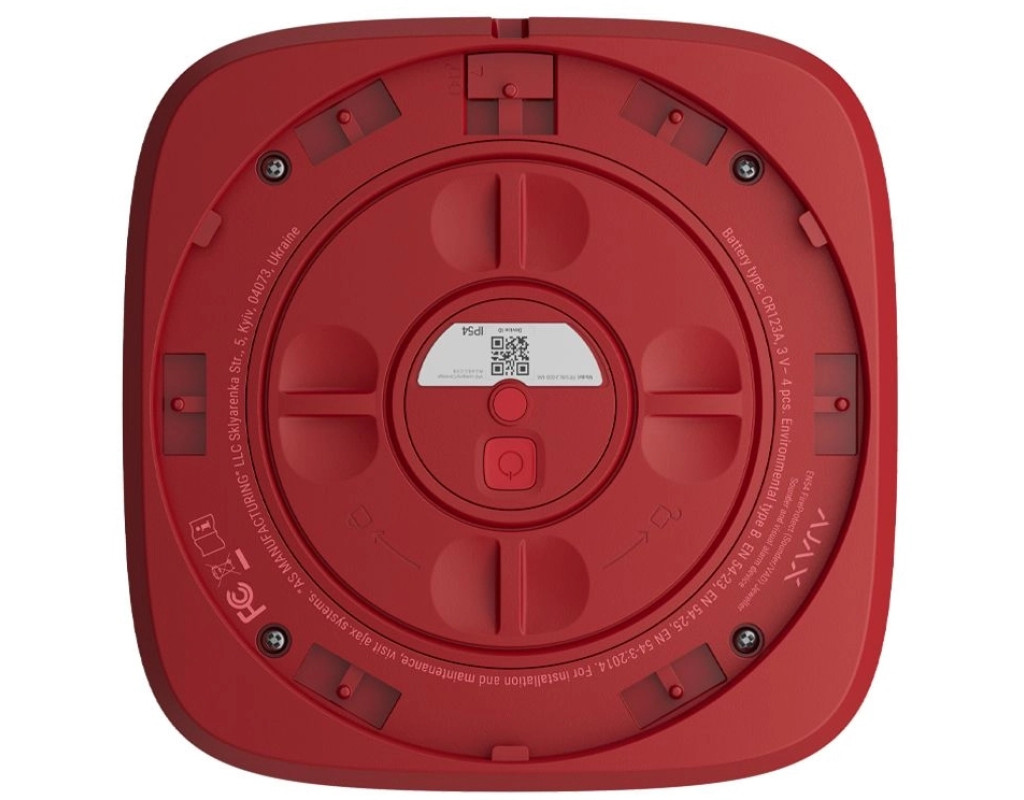 Ajax EN54 FireProtect VAD Sounder Jeweller — це бездротовий адресний пристрій, який поєднує звуковий оповіщувач (Sounder) та візуальний сигналізатор (VAD) в одному корпусі. Пристрій сертифікований за стандартами EN 54-3 (звукові оповіщення) та EN 54-23 (візуальні оповіщення) і гарантує ефективне сповіщення про пожежу навіть у шумних середовищах або для людей з вадами слуху. Після отримання команди тривоги пристрій активує звуковий сигнал гучністю до 100 дБ на відстані 1 метра відповідно до стандарту EN 54-3, а червона LED-рамка починає миготіти з частотою 0,5 Гц згідно з EN 54-23. Активація обох сигналів відбувається одночасно протягом 3 секунд після надходження тривожного сигналу. Пристрій працює через захищений протокол Jeweller (868 МГц), який забезпечує стабільний двосторонній зв'язок з центральною панеллю на відстані до 1700 м у відкритому просторі. Всі події, включаючи низький заряд батареї, саботаж (tamper), втрату зв’язку та інші несправності, передаються до центрального хабу з точною адресною ідентифікацією. Живлення забезпечується батареями CR123A (основна) та CR2032 (резервна для tamper), що забезпечує автономну роботу пристрою до 5 років при стандартному інтервалі опитування 36 секунд. Монтаж виконується за допомогою кронштейна SmartBracket без необхідності розбирати пристрій. Додавання до системи відбувається через QR-код у мобільному застосунку. Світлодіодні індикатори дозволяють швидко перевірити стан пристрою. |