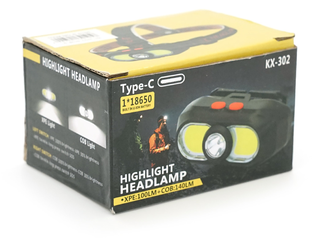 Налобний Ліхтарик KX-302, 3+3 реж., COB, корпус-пластик, водостійкий, 18650 акумулятор, USB кабель, BOX