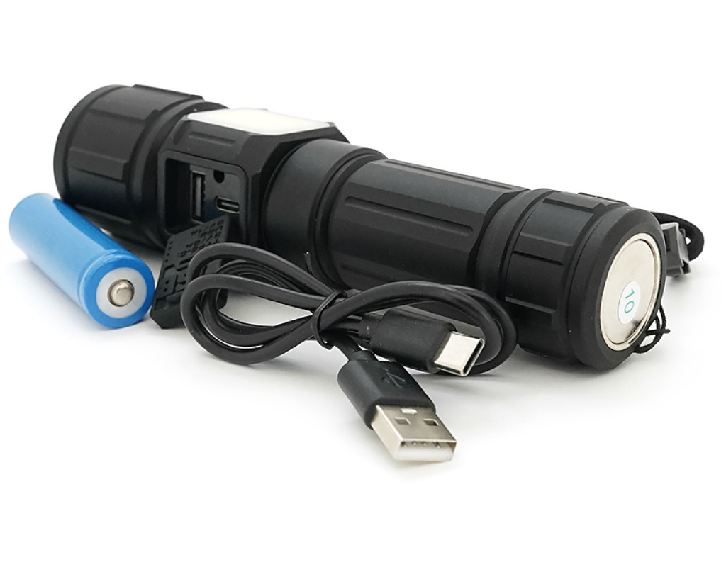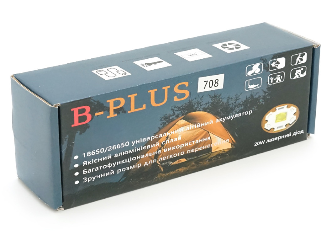 Ліхтарик BP-X708 P90, Zoom, 5+2+2 режими, корпус метал, магніт, акум 18650, індикація заряду, USB кабель, BOX