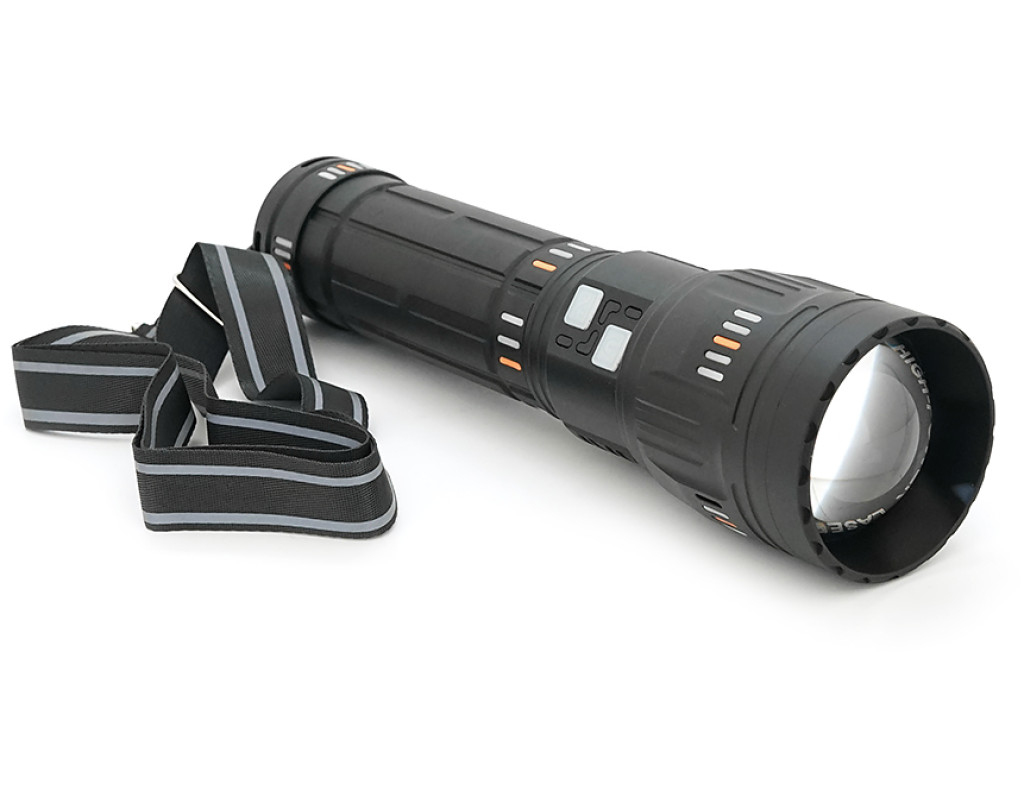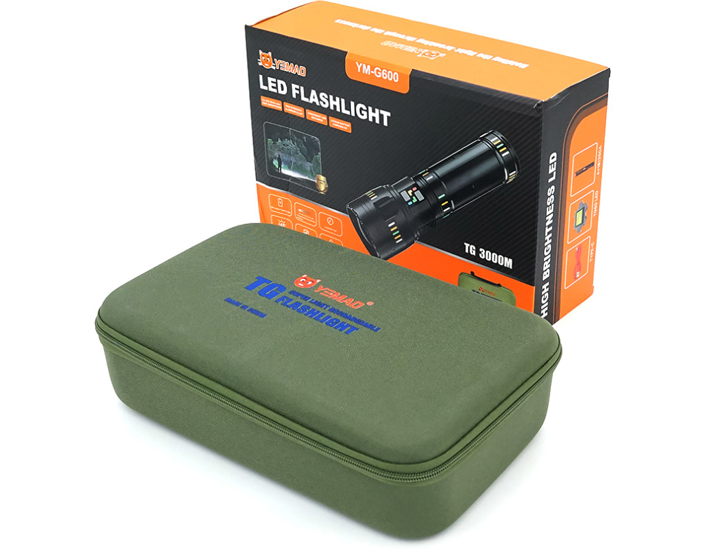 Ліхтар пошуковий YEMAO YM-G600 LED PM60, 4 режими, індикація заряду, живлення від 4(2*18650), IP65, USB кабель, 325х205х100мм, 1,600кг, Black, Чохол+BOX