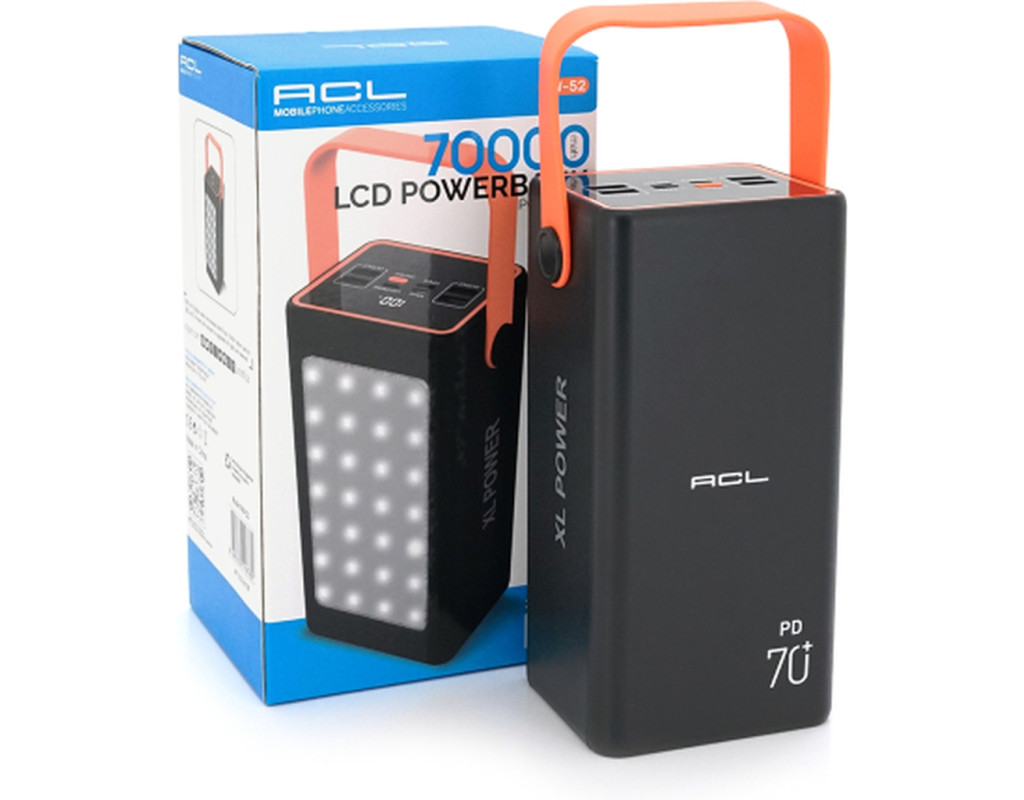 Powerbank ACL PW-52 70000mAh, чорний/білий, у коробці, призначений для заряджання мобільних пристроїв у будь-який час та в будь-якому місці. Завдяки великій ємності батареї та стильному дизайну, він ідеально підходить для активного способу життя. |