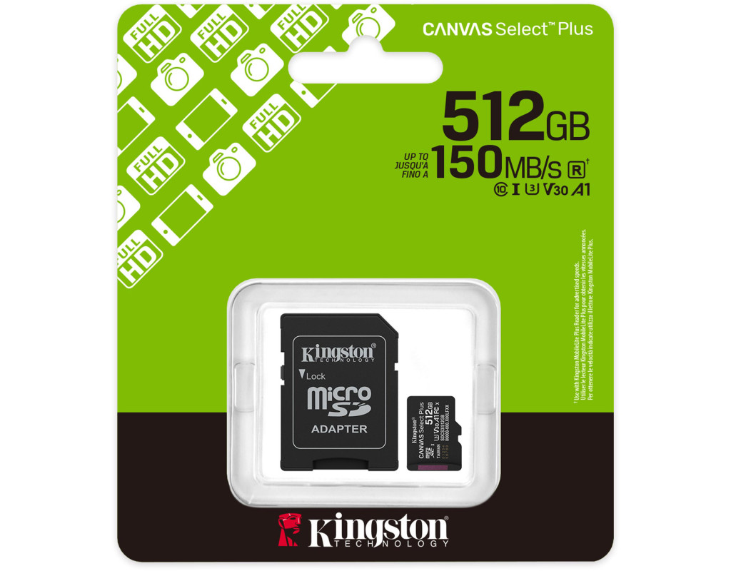| Memory card microSDXC 512GB Kingston Canvas Select Plus Gen3 C10 A1, Retail + adapter |