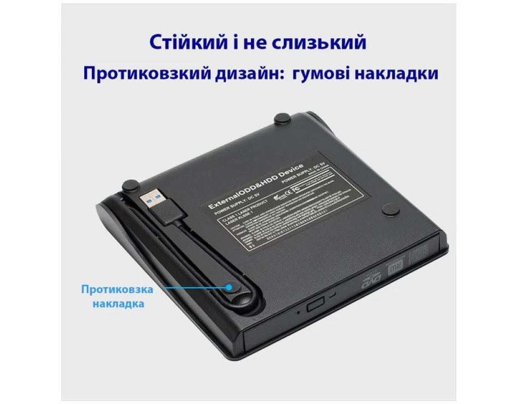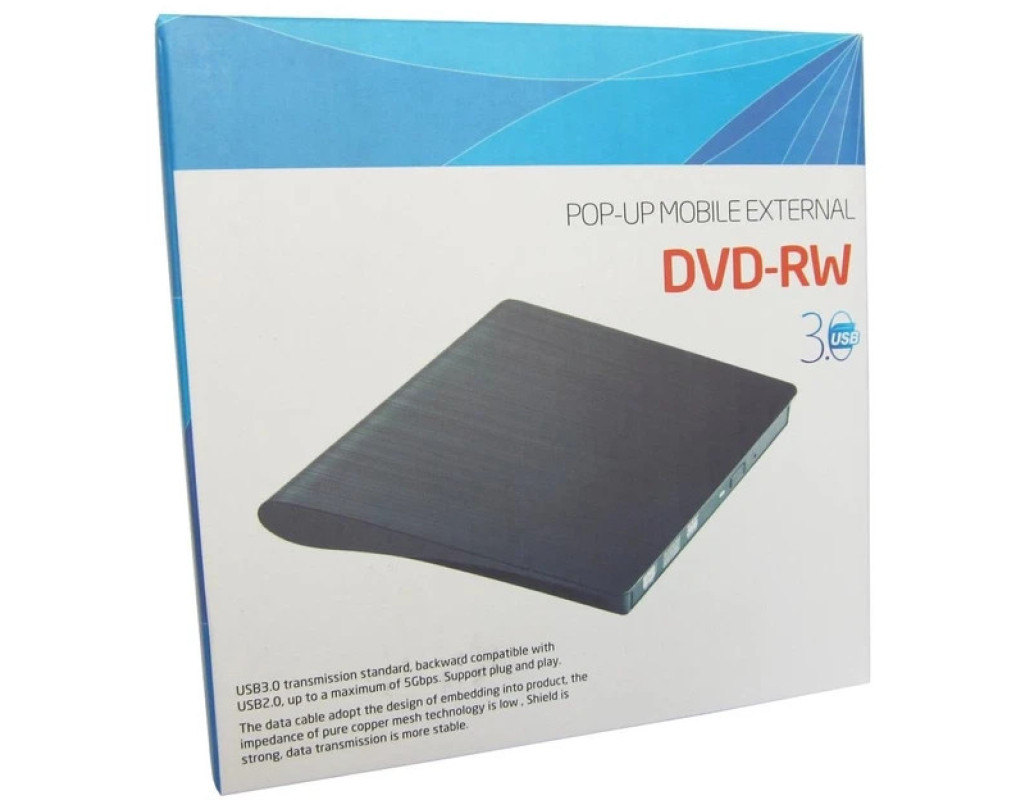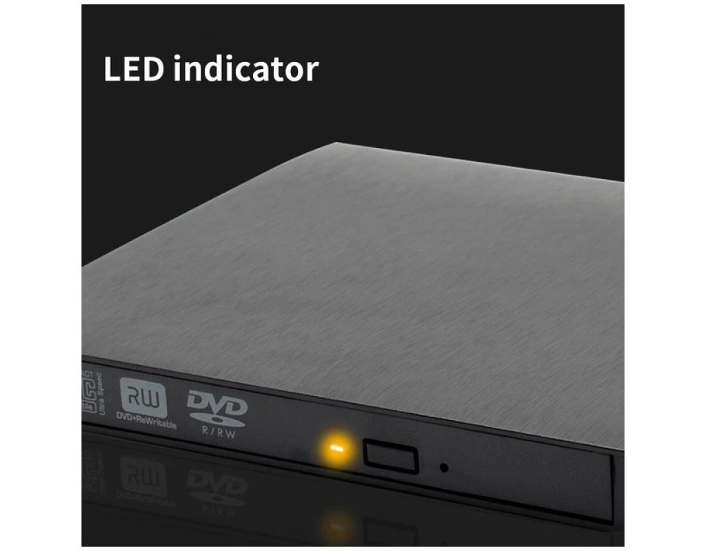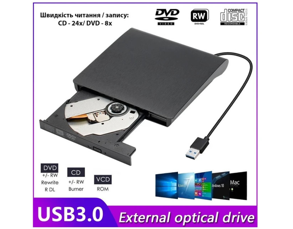 Зовнішній оптичний привід Maiwo USB DVD±R/RW, CD-RW або портативний дисковод підключається до ноутбуків і настільних комп’ютерів через стандартний USB-порт і не потребує встановлення додаткових драйверів чи програмного забезпечення. З його допомогою ви зможете архівувати та зберігати відеозаписи, фотографії, дані та музику на CD або DVD-дисках. Портативний дисковод K525 відтворює та записує дані на всі типи CD та DVD-дисків, працює тихо. Має компактні габарити — 146x143x18 мм, живиться від будь-якого джерела з USB-роз'ємом. Оптичний привід надійно стоїть на столі, а прогумовані ніжки на нижній частині корпусу запобігають його ковзанню по поверхні. Технічні характеристики: