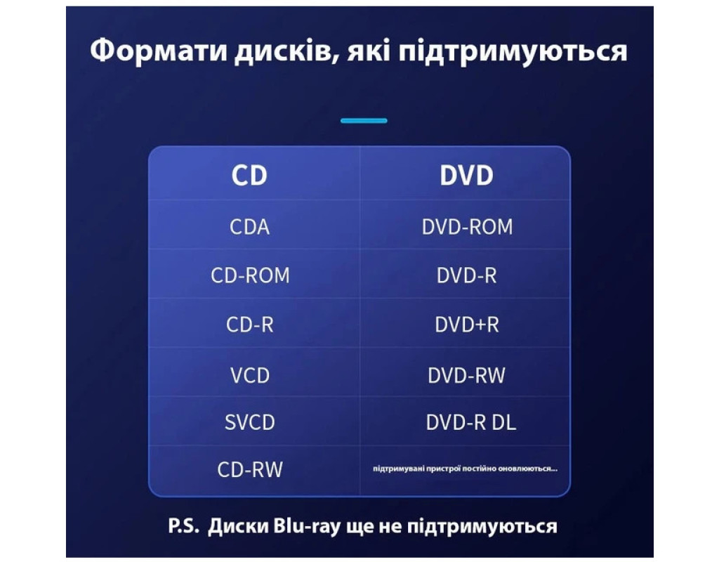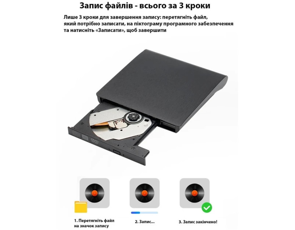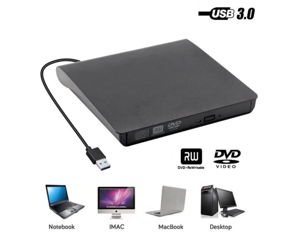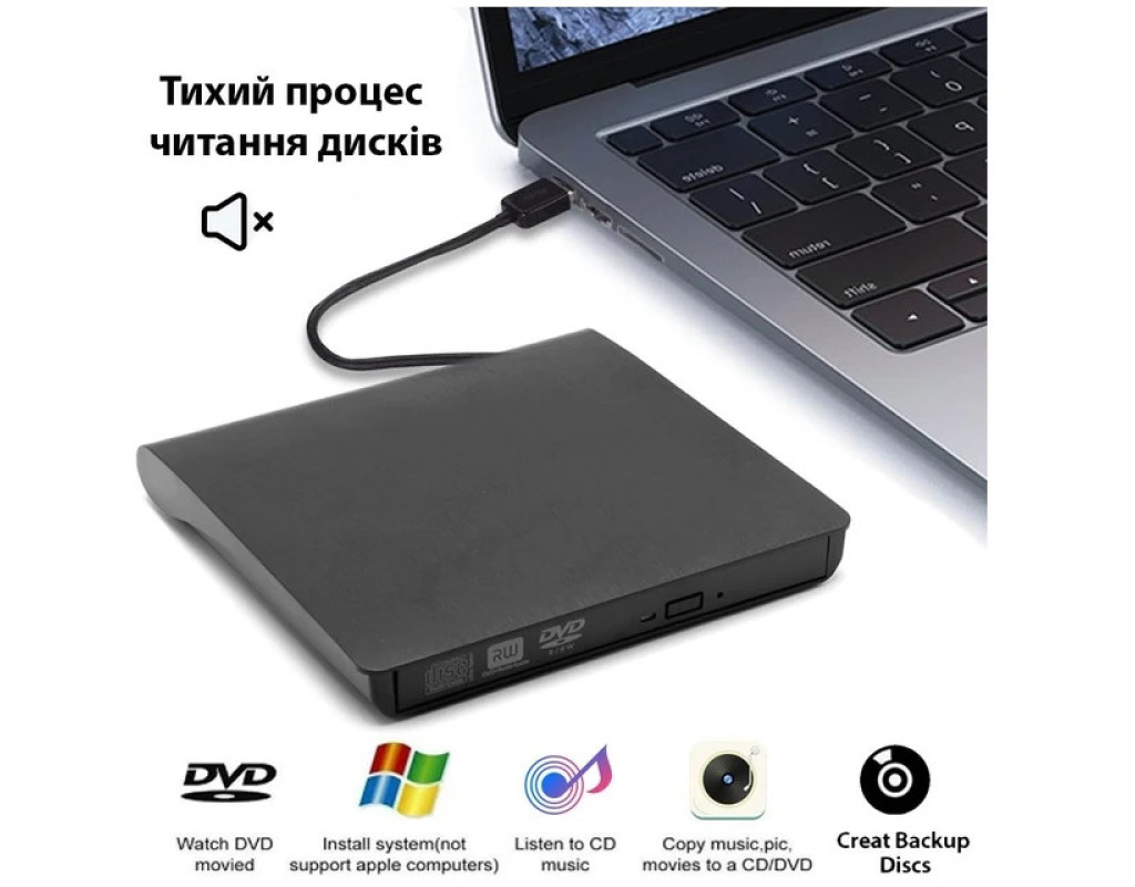 Зовнішній оптичний привід Maiwo USB DVD±R/RW, CD-RW або портативний дисковод підключається до ноутбуків і настільних комп’ютерів через стандартний USB-порт і не потребує встановлення додаткових драйверів чи програмного забезпечення. З його допомогою ви зможете архівувати та зберігати відеозаписи, фотографії, дані та музику на CD або DVD-дисках. Портативний дисковод K525 відтворює та записує дані на всі типи CD та DVD-дисків, працює тихо. Має компактні габарити — 146x143x18 мм, живиться від будь-якого джерела з USB-роз'ємом. Оптичний привід надійно стоїть на столі, а прогумовані ніжки на нижній частині корпусу запобігають його ковзанню по поверхні. Технічні характеристики: