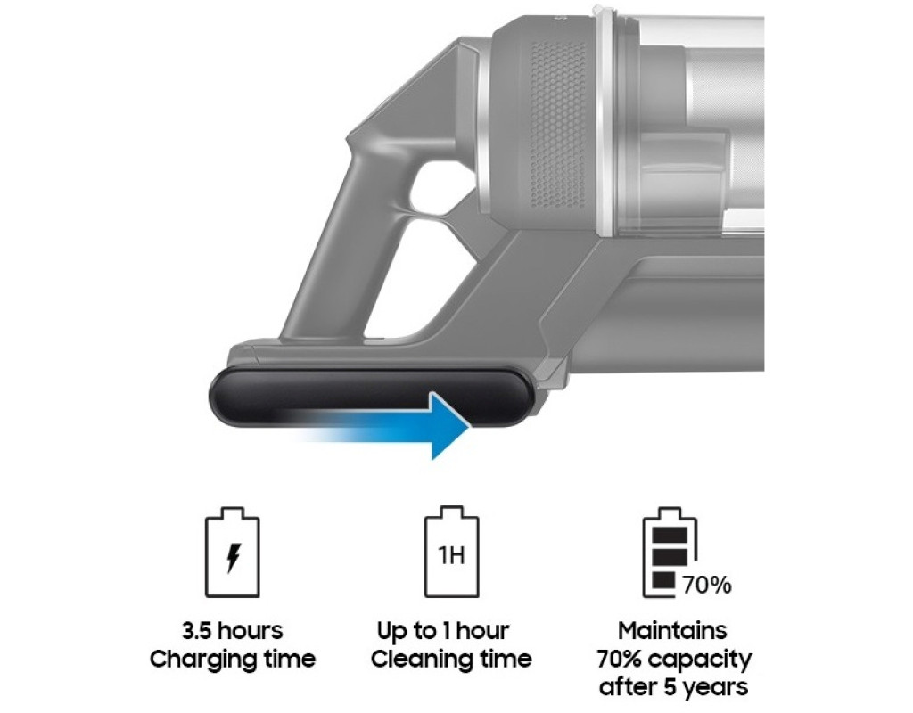 | Довговічний змінний акумулятор Прибирайте довше без підзарядки акумулятора. Акумулятор високої ємності (2500 мА·год*) забезпечує роботу пилососа до 1 год**. Крім того, ви зможете замінити його на запасний*** і продовжити час прибирання до 2 годин. Після 500 циклів заряджання-розряджання акумулятор зберігає до 70%" початкової ємності |