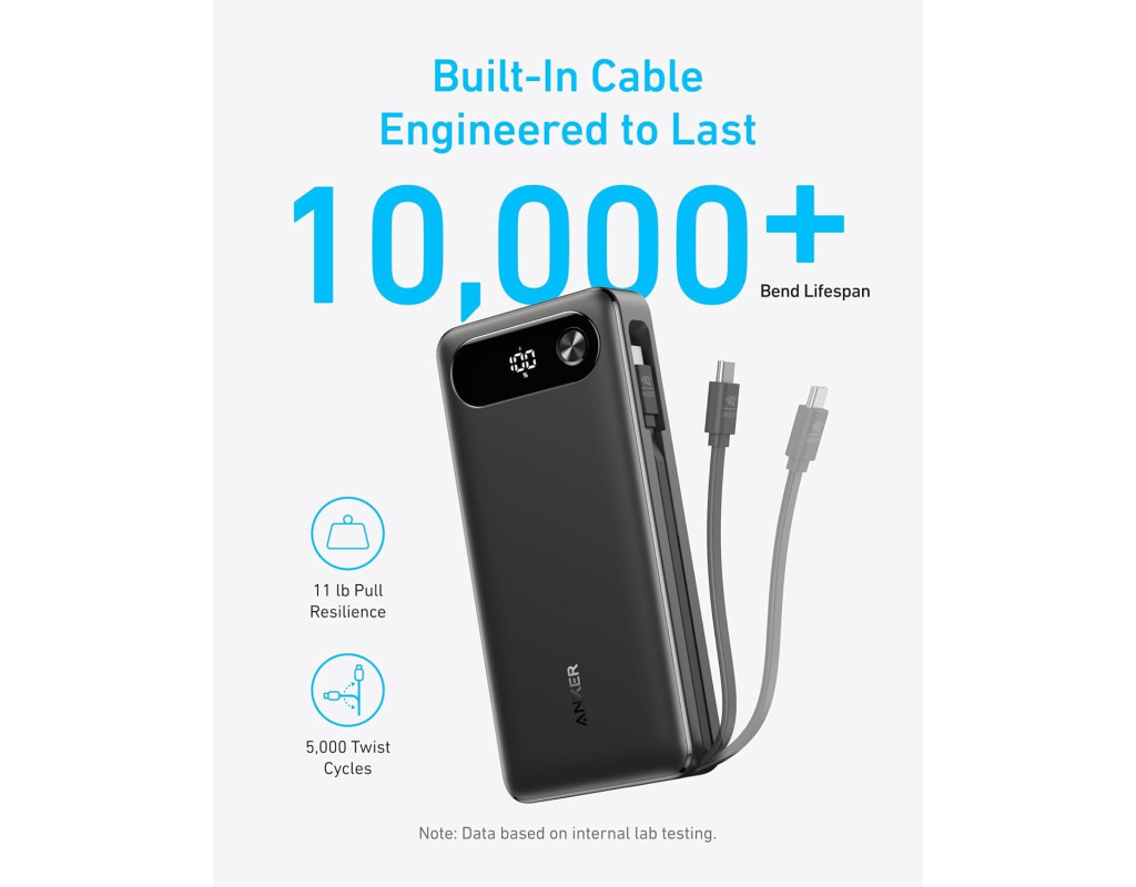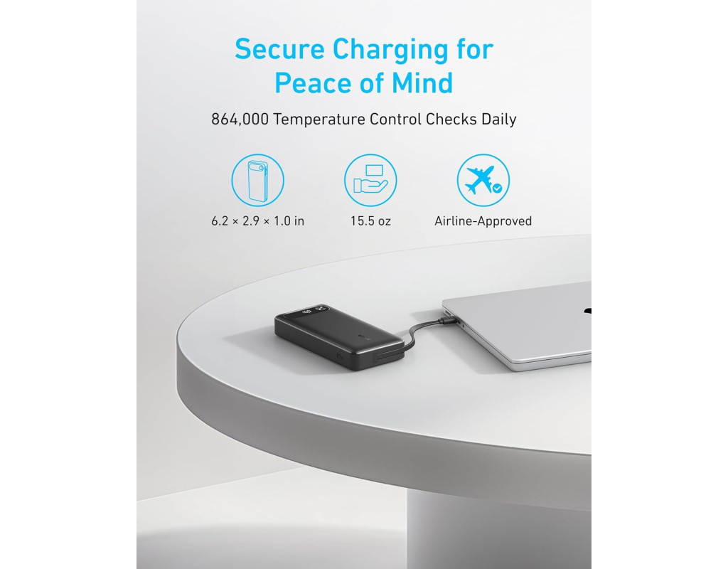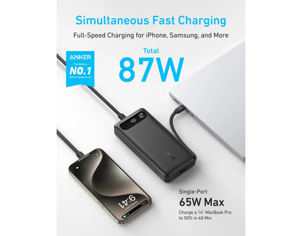 Розподіляйте 87W між трьома пристроями одночасно, при цьому один може отримати до 65W — швидка зарядка iPhone, Samsung або 14" MacBook Pro до 50% менше ніж за 40 хвилин. Швидка зарядка кабелем Вбудований кабель дозволяє зарядити iPhone 15 Pro до 58% або MacBook Air до 52% усього за 30 хвилин. Павербанк можна повністю зарядити за 1.5 години з 65W адаптером (не входить у комплект поставки). 20 000 мА год для тривалого використання Забудьте про розряджені батареї — забезпечує стабільну та надійну зарядку всіх ваших пристроїв, дозволено брати в авіаперельоти. Довше працює, швидше заряджає Вбудований USB-C кабель витримує понад 10 000 вигинів, гарантуючи надійну зарядку та зручне зберігання. |