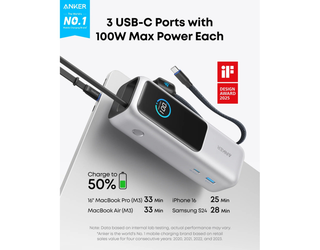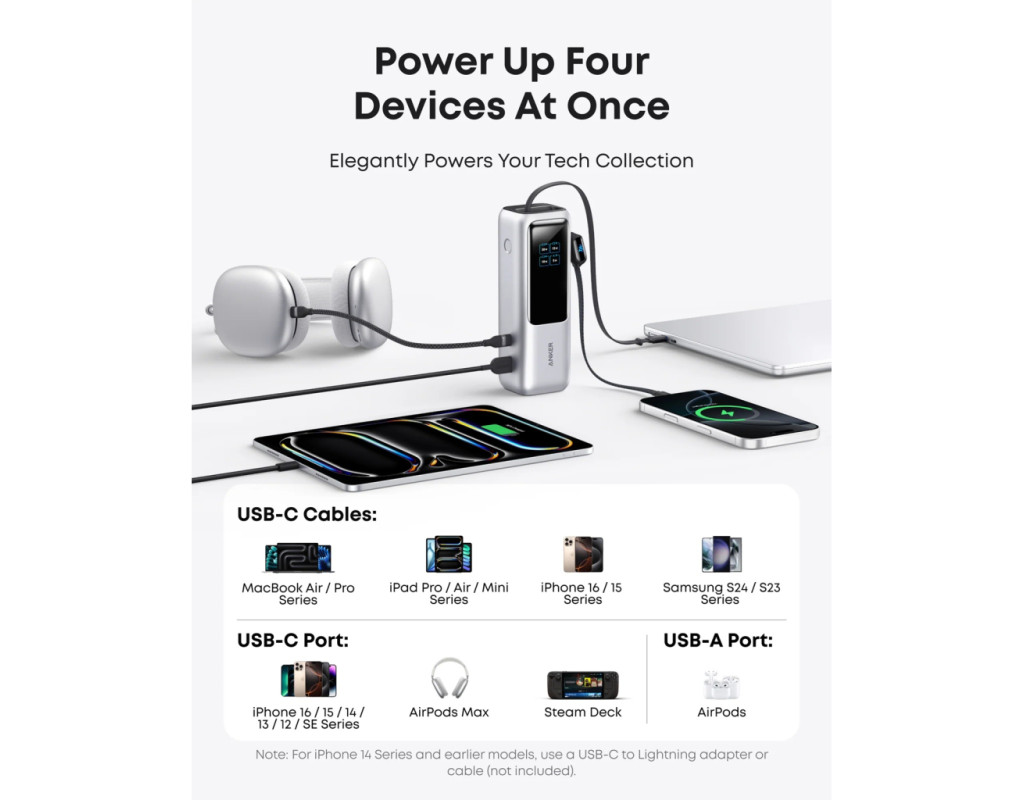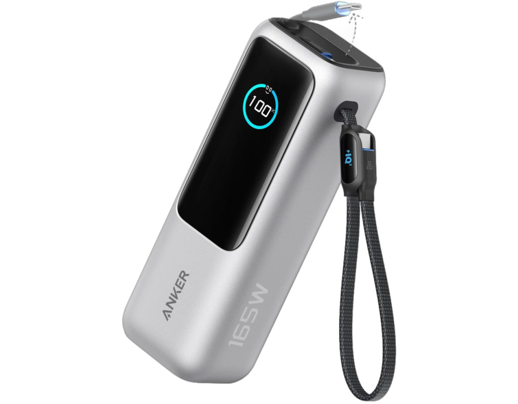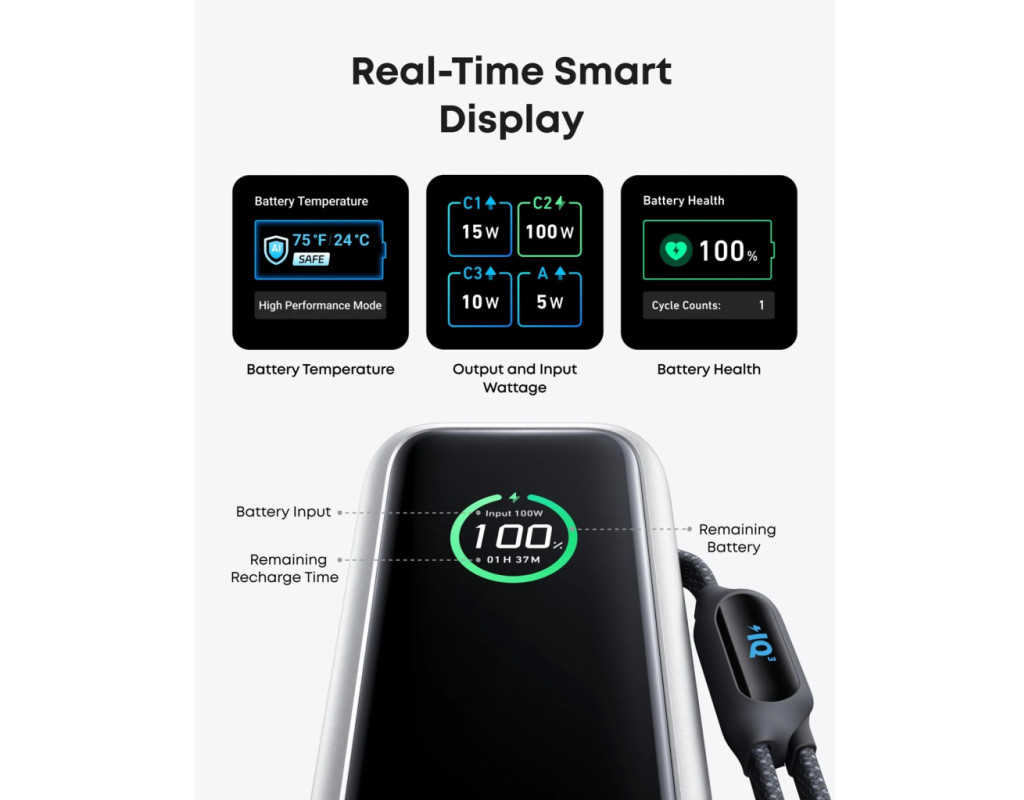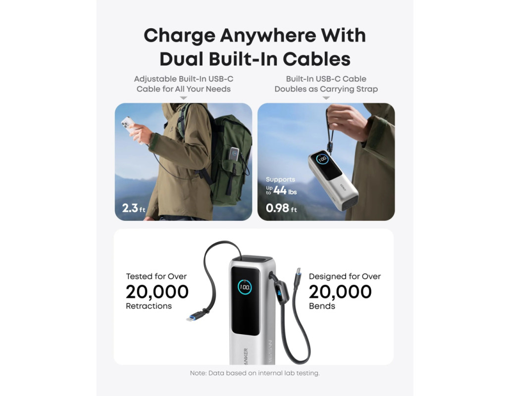 Anker Power Bank оснащений одним портом USB-C (до 100 Вт) та одним USB-A (до 33 Вт), а також двома вбудованими кабелями USB-C (до 100 Вт), що дозволяє заряджати до чотирьох пристроїв одночасно. Один кабель повністю ховається всередину корпусу, другий — виконує ще й роль зручного ремінця для перенесення. Жодних зайвих дротів — усе завжди під рукою.