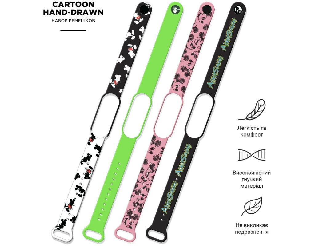 Комплект ремінців Armorstandart для Xiaomi Mi Band 7/6/5 Cartoon hand-drawn 4шт - барвистий комплект ремінців з неповторними принтами, якими ви зможете доповнити будь-який образ, а також привернути увагу оточуючих. Даний ремінець сумісний з Mi Band 7, Mi Band 6, Mi Band 6 Висока якість Надійність Особливості:
