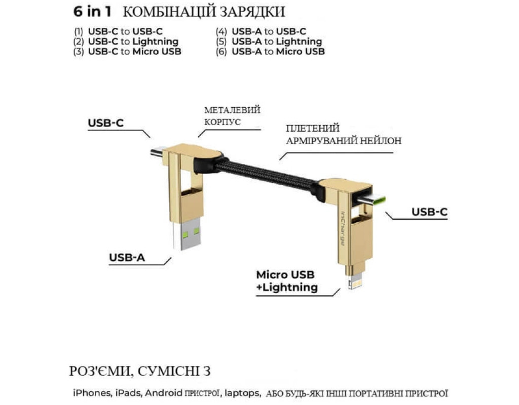 inCharge X (6in1) — ультракомпактний кабель, який дозволяє передавати дані та здійснювати надшвидку зарядку до 100 Вт, а також заряджати пристрої Apple до 27 Вт. Завдяки багатофункціональній конструкції 6-в-1 він сумісний майже з усіма мобільними пристроями. Ідеальний для тих, хто шукає компактне рішення для швидкої зарядки. inCharge X — універсальний кабель для будь-яких пристроїв у кишеньковому форматі. (модель доступна у 3-х кольорах — чорному, синьому та бежевому) Особливості: • 6 в 1 — підтримує всі популярні типи з’єднань: USB-A → USB-C; USB-A → MicroUSB; USB-A → Lightning; USB-C → USB-C; USB-C → MicroUSB; USB-C → Lightning • швидкість передачі даних: 480 Мбіт/с / 60 Мбіт/с • ідеально для дому, офісу або подорожей — завдяки універсальності та надійності • сумісність: iPhone, iPad, iPod, Android, ноутбуки, планшети, пристрої USB-C, пристрої з форматом Micro USB • матеріали: металевий корпус; 200 мідних проводів в оплітці; магніти N52; армований TPU-кабель; нейлонове армування; арамідне волокно Рекомендації щодо використання та догляду: • уникайте надмірного згинання кабелю під гострим кутом, особливо біля роз’ємів — це подовжить термін служби • не піддавайте кабель впливу вологи, прямих сонячних променів чи високих температур • для очищення достатньо протерти кабель м’якою сухою або злегка вологою тканиною; не використовуйте агресивні хімічні засоби • регулярно перевіряйте цілісність оплітки та роз’ємів, щоб уникнути короткого замикання • не використовуйте кабель із пошкодженими конекторами чи у разі поміченого перегріву • гарантія не поширюється на пошкодження, що не є заводським браком, а також на наслідки перегріву чи неправильного використання |