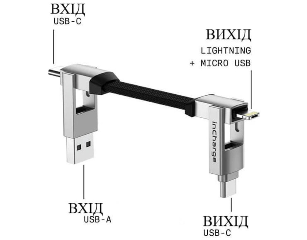 inCharge 6 (6in1) — компактний універсальний кабель 6-в-1, який поєднує всі основні типи роз’ємів для зарядки та передачі даних. Його можна носити на ключах або в кишені — він завжди буде під рукою, коли потрібно підключити будь-який пристрій, незалежно від бренду чи типу порту.