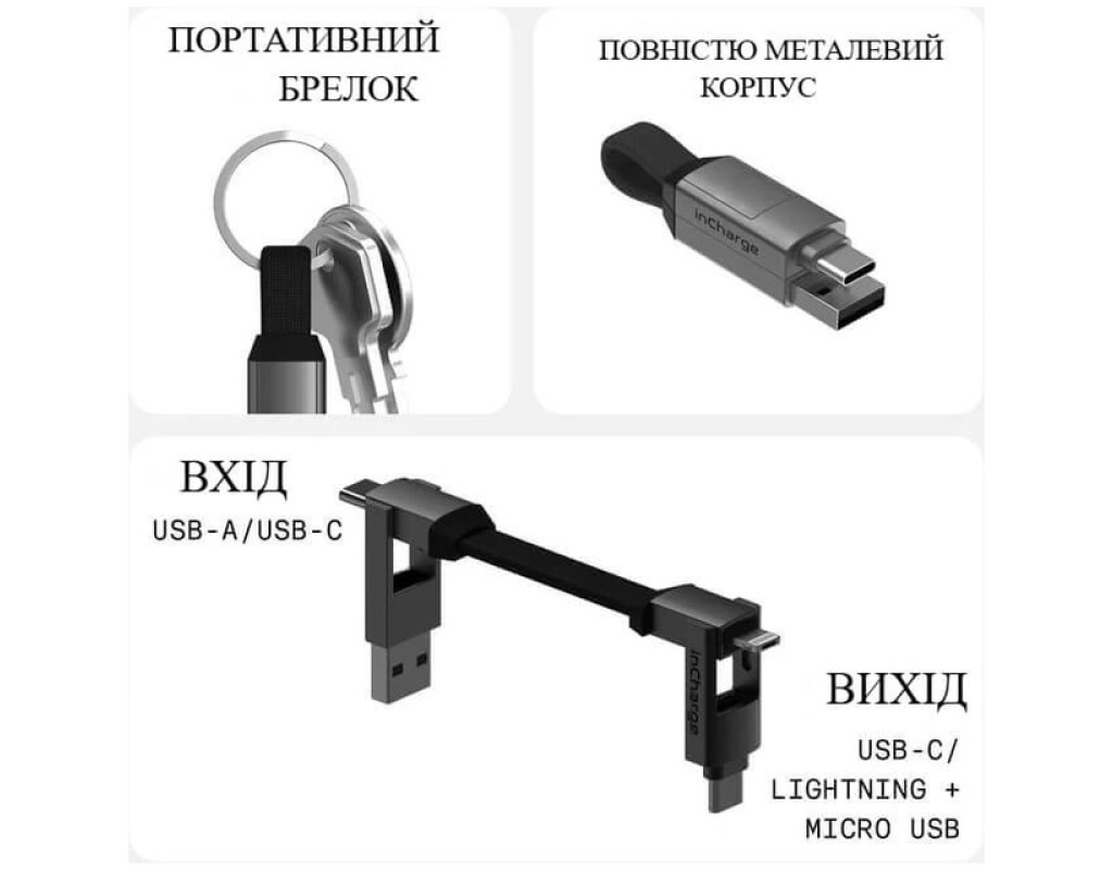 inCharge 6 (6in1) — компактний універсальний кабель 6-в-1, який поєднує всі основні типи роз’ємів для зарядки та передачі даних. Його можна носити на ключах або в кишені — він завжди буде під рукою, коли потрібно підключити будь-який пристрій, незалежно від бренду чи типу порту. (модель доступна у 3-х кольорах — сірому, золотому та білому) Особливості: • 6 в 1 — підтримує всі популярні типи з’єднань: USB-A → USB-C; USB-A → MicroUSB; USB-A → Lightning; USB-C → USB-C; USB-C → MicroUSB; USB-C → Lightning • швидкість зарядки: до 15 Вт (5 В/3 А) — ідеально для більшості смартфонів і аксесуарів • швидкість передачі даних: 480 Мбіт/с / 60 Мбіт/с • магнітна фіксація — кабель легко закріпити на зв’язці ключів • запатентована конструкція дозволяє мати 6 різних зарядних кабелів • довжина у складеному вигляді: приблизно 6 см • ідеально для дому, офісу або подорожей — завдяки універсальності та надійності • сумісність: iPhone, Android, планшети, пристрої з форматом Micro USB, пристрої USB-C • матеріали: металевий корпус із цинк-алюмінієвого сплаву; 90 мідних дротів в оплітці; магніти N52; армований TPU кабель; нейлонове армування Рекомендації щодо використання та догляду: • уникайте надмірного згинання кабелю під гострим кутом, особливо біля роз’ємів — це подовжить термін служби • не піддавайте кабель впливу вологи, прямих сонячних променів чи високих температур • для очищення достатньо протерти кабель м’якою сухою або злегка вологою тканиною; не використовуйте агресивні хімічні засоби • регулярно перевіряйте цілісність оплітки та роз’ємів, щоб уникнути короткого замикання • не використовуйте кабель із пошкодженими конекторами чи у разі поміченого перегріву • гарантія не поширюється на пошкодження, що не є заводським браком, а також на наслідки перегріву чи неправильного використання |
