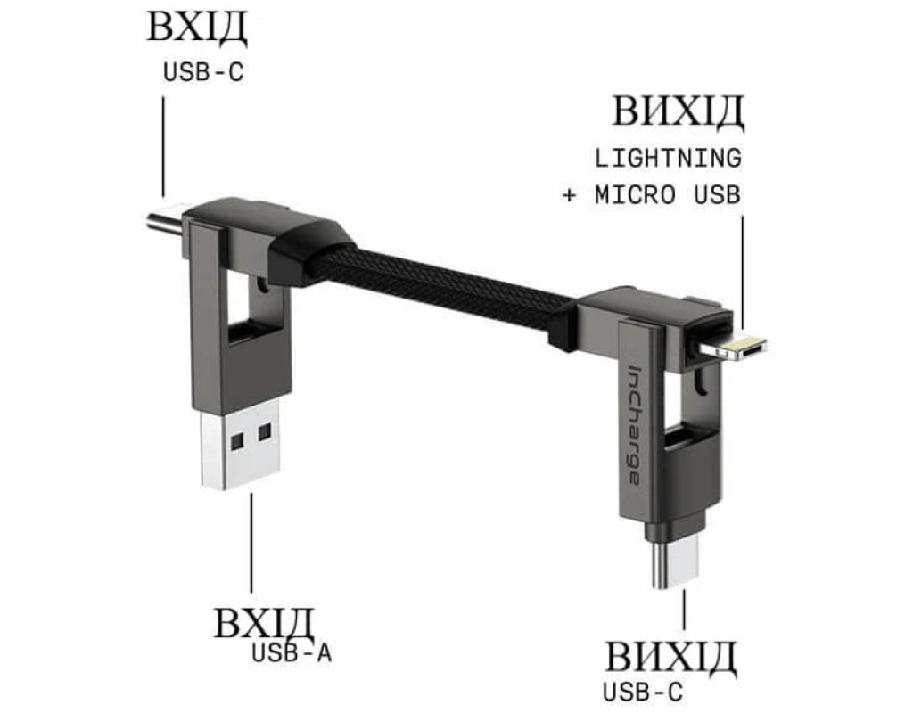 inCharge 6 (6in1) — компактний універсальний кабель 6-в-1, який поєднує всі основні типи роз’ємів для зарядки та передачі даних. Його можна носити на ключах або в кишені — він завжди буде під рукою, коли потрібно підключити будь-який пристрій, незалежно від бренду чи типу порту. (модель доступна у 3-х кольорах — сірому, золотому та білому) Особливості: • 6 в 1 — підтримує всі популярні типи з’єднань: USB-A → USB-C; USB-A → MicroUSB; USB-A → Lightning; USB-C → USB-C; USB-C → MicroUSB; USB-C → Lightning • швидкість зарядки: до 15 Вт (5 В/3 А) — ідеально для більшості смартфонів і аксесуарів • швидкість передачі даних: 480 Мбіт/с / 60 Мбіт/с • магнітна фіксація — кабель легко закріпити на зв’язці ключів • запатентована конструкція дозволяє мати 6 різних зарядних кабелів • довжина у складеному вигляді: приблизно 6 см • ідеально для дому, офісу або подорожей — завдяки універсальності та надійності • сумісність: iPhone, Android, планшети, пристрої з форматом Micro USB, пристрої USB-C • матеріали: металевий корпус із цинк-алюмінієвого сплаву; 90 мідних дротів в оплітці; магніти N52; армований TPU кабель; нейлонове армування Рекомендації щодо використання та догляду: • уникайте надмірного згинання кабелю під гострим кутом, особливо біля роз’ємів — це подовжить термін служби • не піддавайте кабель впливу вологи, прямих сонячних променів чи високих температур • для очищення достатньо протерти кабель м’якою сухою або злегка вологою тканиною; не використовуйте агресивні хімічні засоби • регулярно перевіряйте цілісність оплітки та роз’ємів, щоб уникнути короткого замикання • не використовуйте кабель із пошкодженими конекторами чи у разі поміченого перегріву • гарантія не поширюється на пошкодження, що не є заводським браком, а також на наслідки перегріву чи неправильного використання |