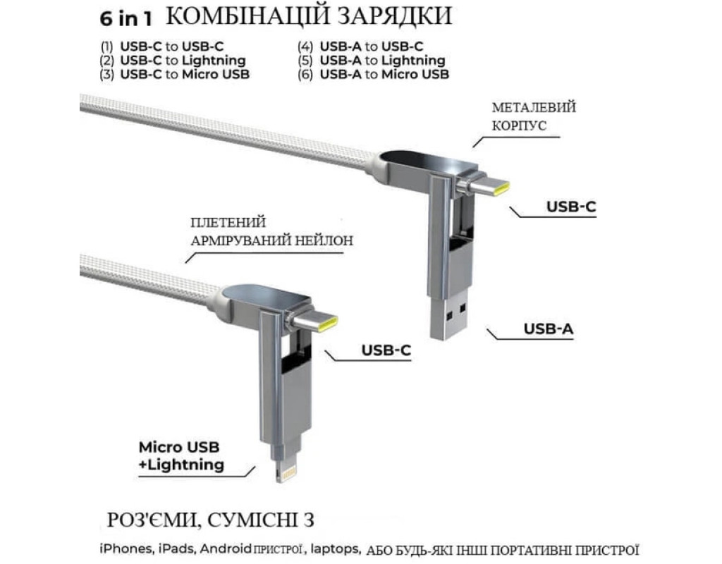 Особливості: • 6 в 1 — підтримує всі популярні типи з’єднань: USB-A → USB-C; USB-A → Lightning; USB-A → Micro USB; USB-C → USB-C; USB-C → Lightning; USB-C → Micro USB • потужність зарядки до 100 Вт — підходить для заряджання ноутбуків • швидкість передачі даних: 480 Мбіт/с / 60 Мбіт/с • плетена оплітка — забезпечує довговічність і стійкість до зламів • алюмінієві конектори - преміальна якість збірки • довжина 3 м — зручно для зарядки пристроїв навіть на відстані,максимальна мобільність • сумісність: Phone, iPad, AirPods; Android; ноутбуки, планшети; пристрої з USB-C; пристрої з Micro USB • комплектація коробки: кабель inCharge XL 3 м ; магнітна опора для столу; • матеріали: металевий корпус; 200 мідних проводів в обплетенні; магніти N52; армований TPU кабель; нейлонове армування; арамідне волокно