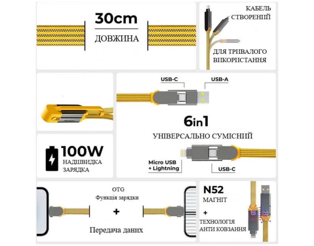 Тип - кабель, Тип конектора 1 - Lightning, USB Type-C, micro USB, USB, Тип конектора 2 - micro USB, Lightning, USB Type-C, довжина - 0.3 м, Металевий корпус, 200 плетених мідних дротів, магніти N52 Швидкість передачі даних 480 Мбіт/с/60Мбіт/с, Колір - жовтий