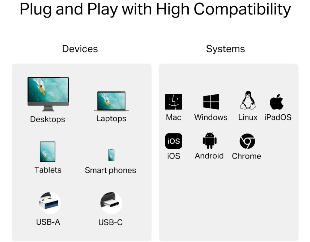 • Plug and Play з універсальною сумісністю: просто підключіть і використовуйте без будь-яких складних кроків на ваших пристроях USB-C або USB-A, таких як настільні комп'ютери, ноутбуки, телефони та планшети, що підтримують Mac OS, Windows, iPadOS, iOS, Android, Linux OS та Chrome OS.
