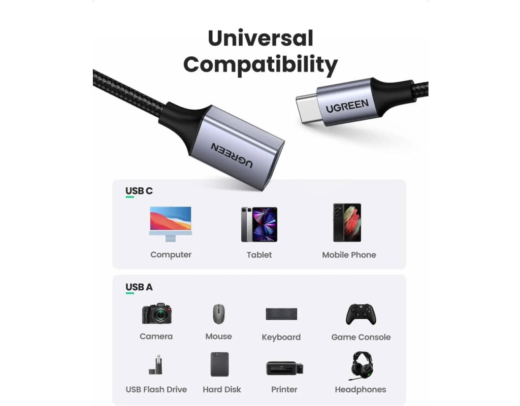 Адаптер OTG у нейлоновому плетеному обплетенні преміумкласу додасть додаткової міцності для тривалішого терміну експлуатації. Кабель OTG Ugreen 70889 USB 3.0 набагато надійніший, ніж інші. Універсальна сумісність (частинковий список):