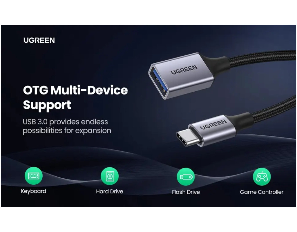 Кабель USB-C OTG додає стандартний USB A жіночий порт до вашого ноутбука та планшету роз'ємом USB Type-C для під'єднань USB аксесуарів, як-от миша, клавіатура, ігровий контролер, зовнішній накопичувач і різні зовнішні аксесуари.