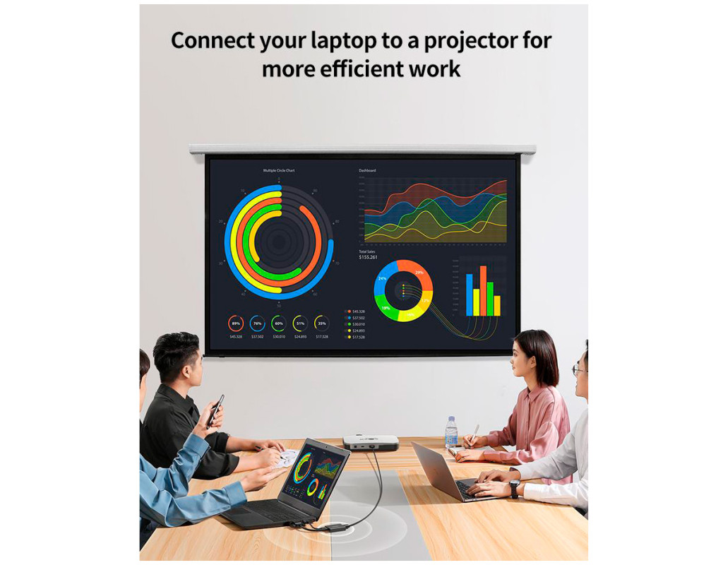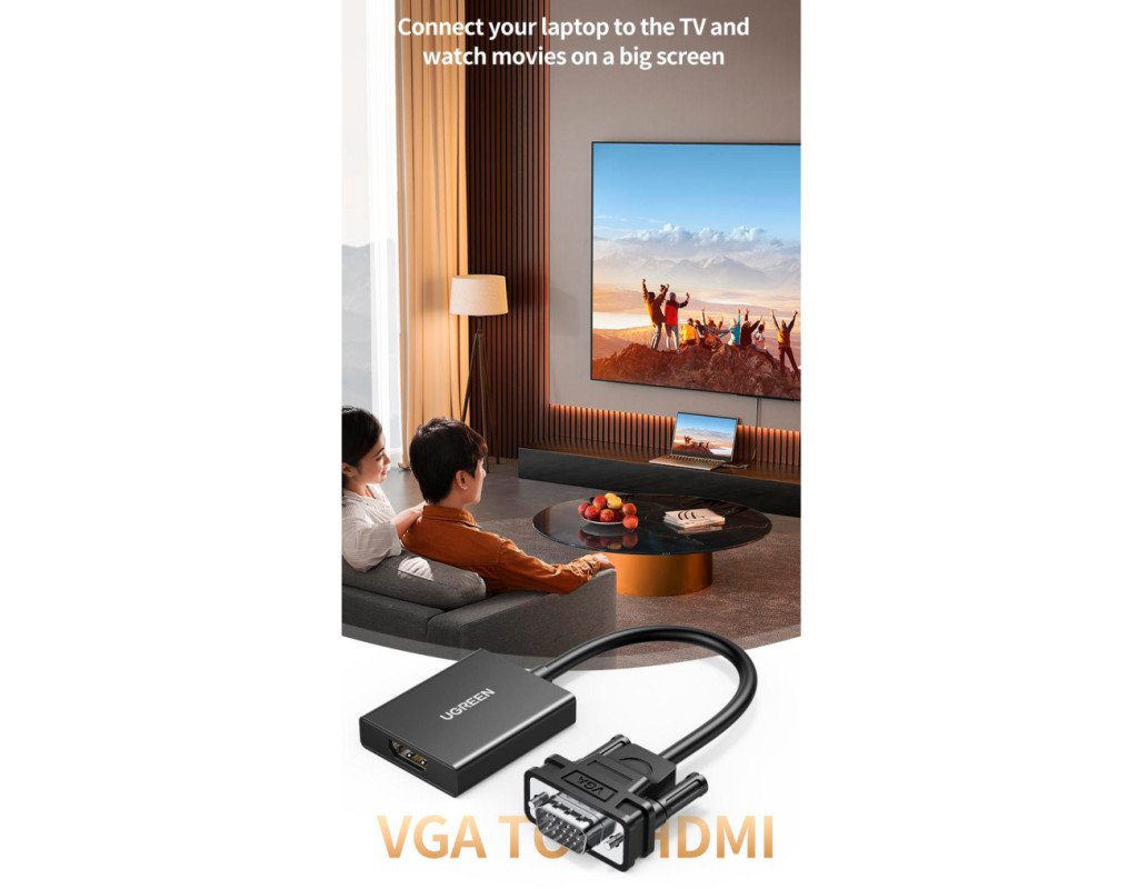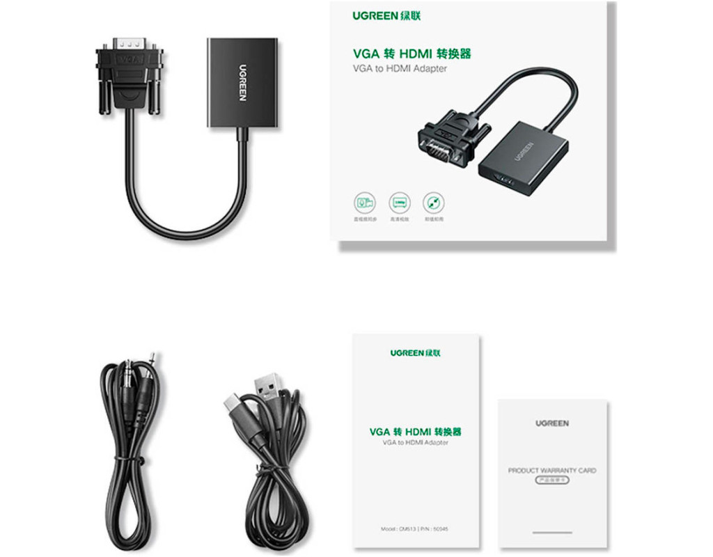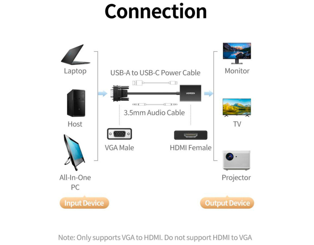 Перетворення VGA на HDMI Ви можете безпосередньо під'єднати вихід VGA вашого старого комп'ютера до вхідного порту HDMI, наприклад, монітора, телевізора, проектора тощо. Забезпечує під'єднання до дисплеїв і проекторів, які підтримують тільки вхід HDMI. Примітка. Цей продукт несумісний із перетворенням HDMI у VGA (наприклад, комп'ютер із портом HDMI для монітора з роз'ємом VGA). Вхідна роздільна здатність до 1920 x 1080 Підтримує роздільну здатність відео Full HD до 1080p (1920 x 1080 / 60 Гц) і підтримує найвищу якість відео через вихід VGA, тож ви можете дивитися фільми з сім'єю та друзями на великому екрані. Підключення до ПК до проектора Використовує комп'ютер, оснащений тільки роз'ємом VGA, тому ви можете легко відображати матеріали конференції, що зберігаються на вашому комп'ютері, на великому проекторі з підтримкою HDMI для підвищення ефективності роботи. Синхронізація відео та аудіо Вбудований USB-кабель живлення забезпечує живлення від порту USB-C комп'ютера або зовнішнього джерела живлення, тому ви можете розв'язати проблему нестачі живлення та стабільно передавати відео. За допомогою аудіокабелю 3.5 мм ви можете синхронізувати аудіо та відео. Кабель зменшує спотворення сигналу та втрати під час передавання, даючи змогу слухати якісніше відео та музику. Простота під'єднання Немає потреби в складному встановленні драйверів, просто під'єднайте їх. Компактний дизайн, зручно носити з собою. Сумісна ОС: WinXP, Win Vista, Win7, Win8.1, Win10, Win11, Mac OS, Linux. |