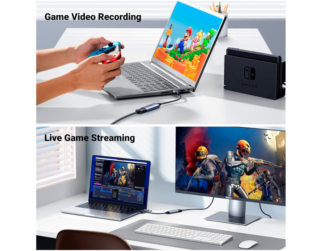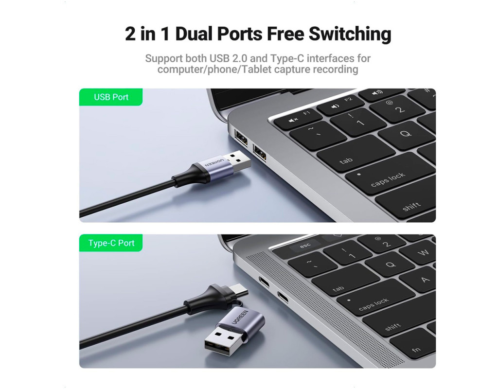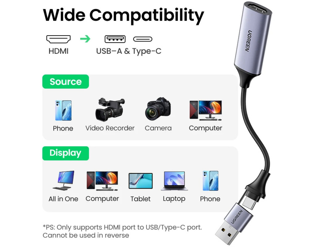 Мапа відеозапису 4K Мапа відеозапису UGREEN HDMI-USB C підтримує передачу 4K/60 кадрів за секунду і записує відео зі швидкістю 1080P/30 кадрів за секунду. Карта запису відео 4K не впливає на ваші особисті ігрові можливості на PS5, Xbox Series X/S або ПК під час потокової передачі або запису. Просте налаштування Карта захоплення UGREEN 4K HDMI-USB не вимагає драйверів і дозволяє підключати та використовувати всі пристрої, такі як ПК, ноутбук, MacBook, iPad Pro/iPad Mini/iPad із системою iPadOS 17 та телефон. Просте налаштування з більшістю програм для потокової передачі та захоплення. USB-карта захоплення 4K має компактний розмір, що спрощує транспортування. Універсальна сумісність Завдяки роз'ємам USB типу A та USB типу C карта захоплення аудіо-відео UGREEN 4K HDMI підтримує більшість ноутбуків, MacBook, iPad, планшетів та телефонів із системами Windows 8.1/10/11, Mac OS, iOS 17, Linux та Android. Також підтримуються пристрої з відеовиходом HDMI, такі як ТВ-приставка, ТВ-приставка, комутатор NS, PS5/PS4, Xbox Series S/X, дзеркальна камера, відеокамера Rasperry Pi. Карта захоплення USB HDMI працює з програмним забезпеченням для потокової передачі та захоплення, таким як Twitch, YouTube, FaceBook, OBS, XSplit, Potplayer, Streamlabs. Міцна конструкція Карта захвату UGREEN HDMI має алюмінієвий корпус для прискорення відведення тепла. Вам не доведеться турбуватися про проблеми з перегріванням навіть після тривалого використання. М'який кабель TPE та посилена конструкція з'єднань запобігають вигину та підвищують довговічність цієї карти потокового захоплення. Універсальність та практичність Карта захоплення потокової передачі ігор UGREEN використовує технологію наднизької затримки, що дозволяє здійснювати потокову передачу в реальному часі, записувати кадри ігрового процесу на комп'ютер без стиснення для відтворення. |