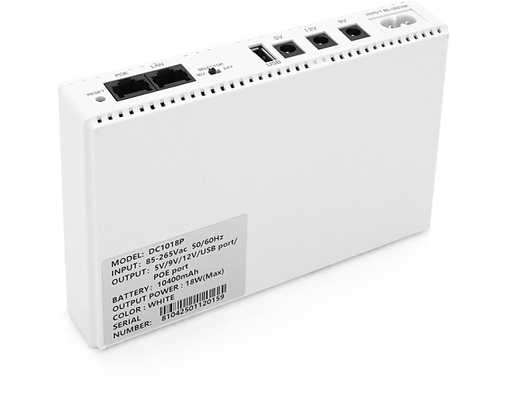 | ДБЖ для роутерів / комутаторів DC1018P, 18W, Output: USB-5V, DC-5V / 9V / 12V, POE-15 / 24V, 1 / 2A, Li-ion 10400mAh, 160х105х32мм, 385 грам, 385 грам, |