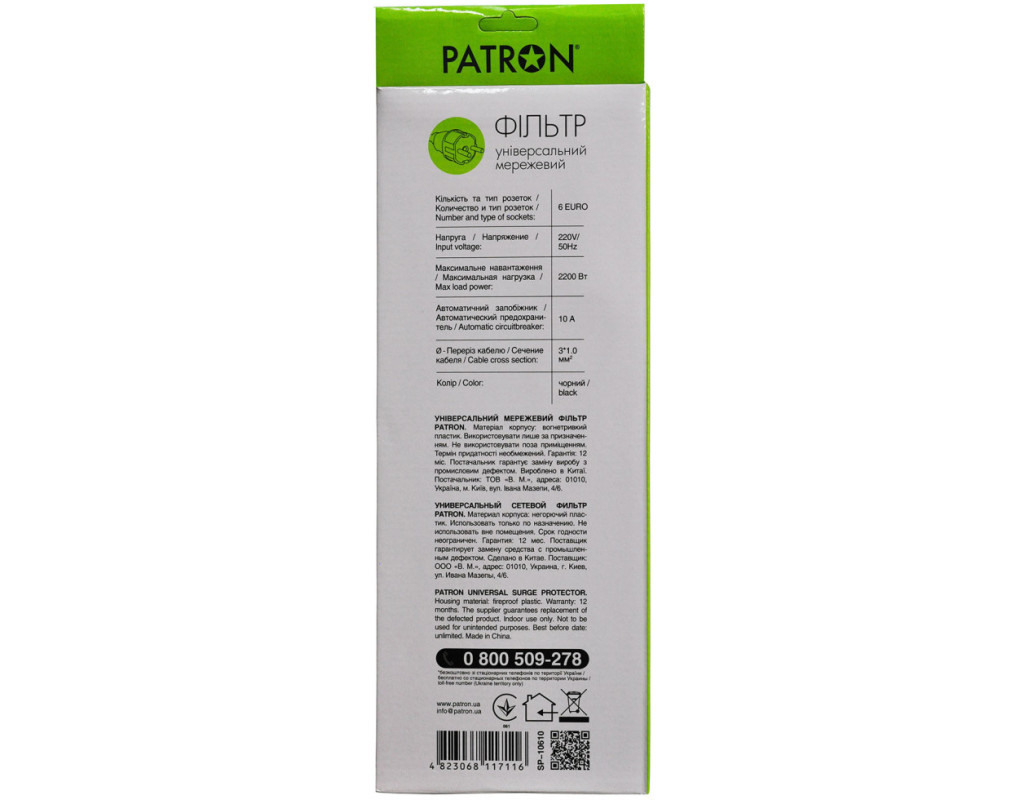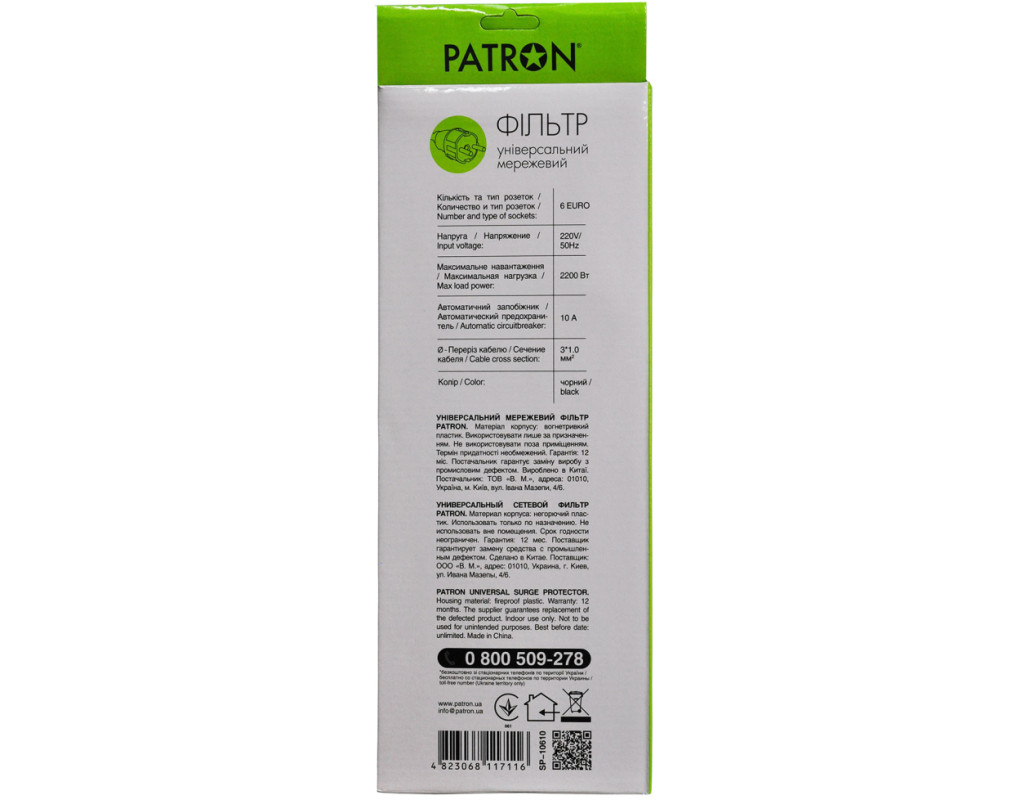 Мережевий фільтр Patron призначений для підключення широкого спектру побутової та комп'ютерної техніки. Фільтр має універсальні розетки типу "євро" з заземленням і захищає електронну техніку від короткого замикання, перепадів напруги і імпульсних перешкод. |