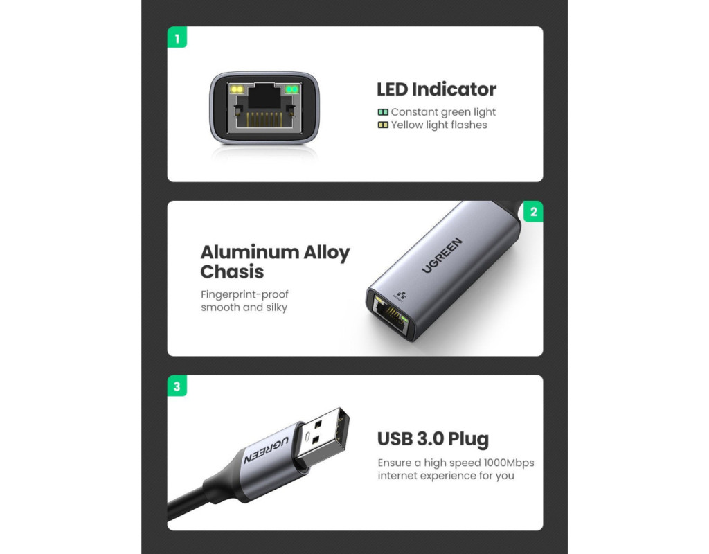 Швидша та стабільна мережа Повна продуктивність Gigabit Ethernet 10/100/1000 Мбіт/с робить цей адаптер USB-Ethernet швидшим і надійнішим, ніж більшість бездротових підключень. Ви можете насолоджуватися грою та фільмами більш плавно. Більше не треба чекати!