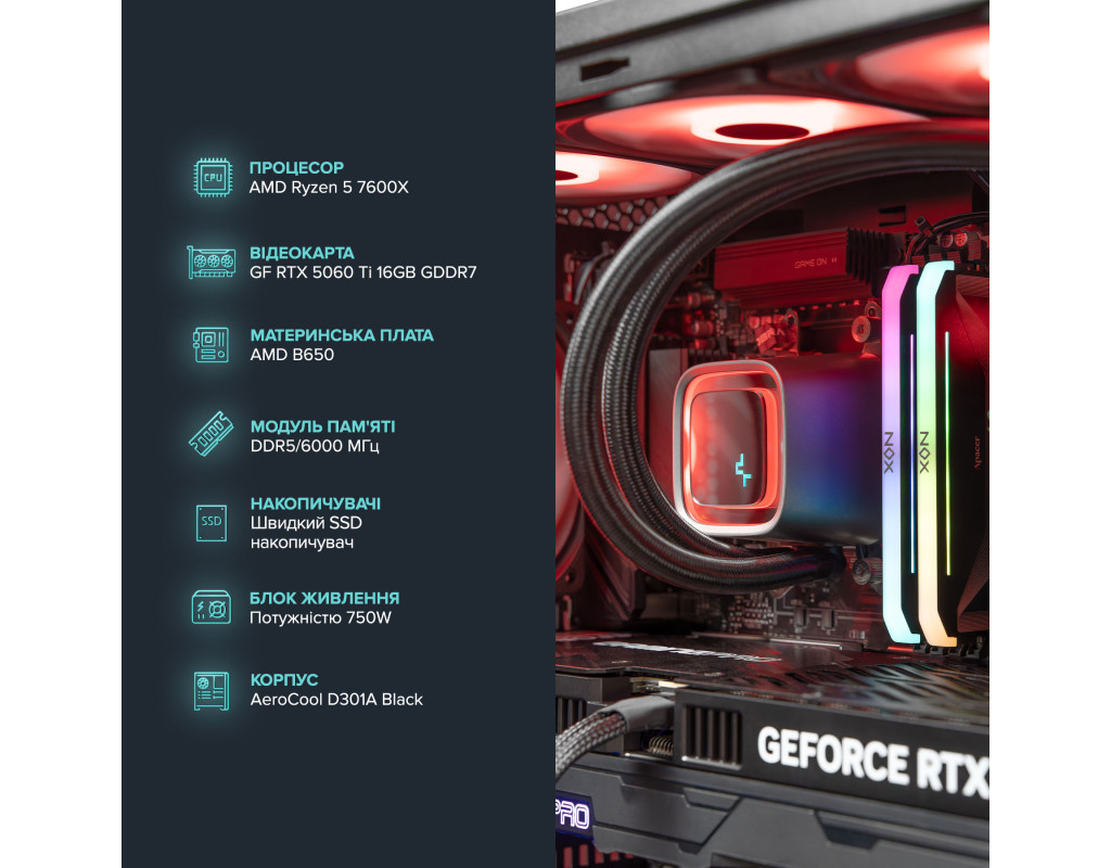 Персональний комп`ютер ASGARD (A76.32.S10.56T.6289); AMD Ryzen 5 7600X (4.7 - 5.3 ГГц) / ОЗП 32 ГБ / SSD 1 ТБ / NVIDIA GeForce RTX 5060 Ti 16 ГБ / без ОП / LAN / без ОС / чорний