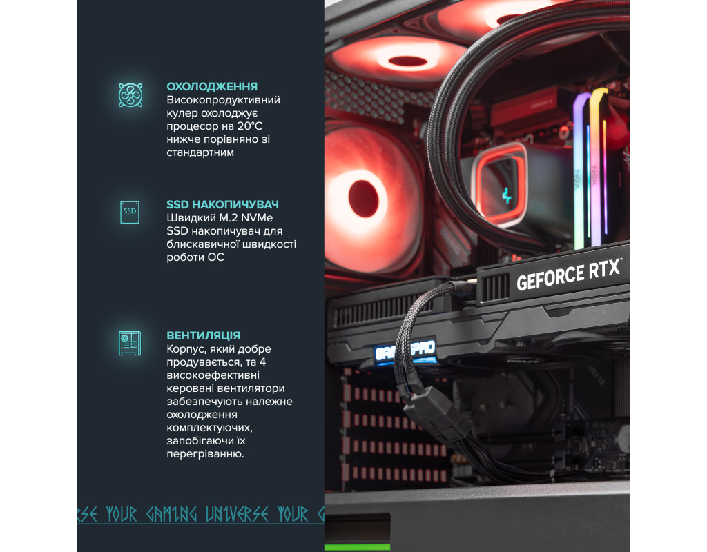 Геймер створює свій персоналізований, ігровий простір, де кожна деталь має особливе значення. Друк ваших улюблених героїв на корпусі, комплектуючі кращих виробників світу, безліч варіантів підсвітки - все це створить неймовірну атмосферу і ще більше занурить вас у світ гри.