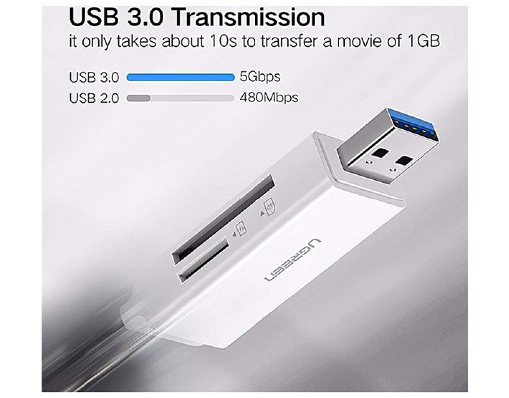 З легкістю читайте більшість карт пам'яті Картридер UGREEN USB 3.0 легко та швидко зчитує практично всі ваші карти пам'яті. Він підтримує карти пам'яті SDXC/SDHC/SD/MMC/RS-MMC/Micro SD/TF/Micro SDXC/Micro SDHC/UHS-I.
