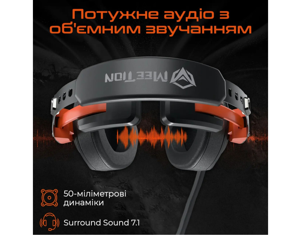 MEETION HP099 - це стильні геймерські навушники з ефектною RGB-підсвіткою, а також міцною металевою конструкцією і комфортними м'якими накладками. Вони оснащені шумопоглинаючим микрофоном, зручним дротовим блоком керування - ідеальне поєднання стильного дизайну, функціональності та комфорту для ваших ігрових перемог.