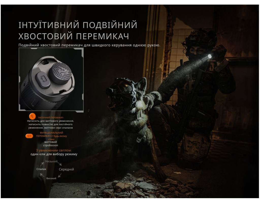 | Ліхтар Fenix TK21R - це високоякісна тактична модель, розроблена для надійної роботи в найважчих умовах. Завдяки міцній конструкції та інноваційним технологіям, цей ліхтар став незамінним інструментом для професіоналів, які займаються патрулюванням, пошуковими операціями та іншими завданнями, що вимагають максимальної витривалості та надійності. Під загартованою лінзою ховається потужний світлодіод Luminus SFT90, що має ресурс роботи до 50,000 годин. Холодний білий промінь, що генерується цим світлодіодом, виходить на яскравість 3600 люмен і дальність до 480 метрів, що забезпечує відмінне освітлення навіть у найтемніших умовах. Особливістю Fenix TK21R є можливість використання не лише в ручному режимі, але і монтаж на зброю за допомогою сумісних кріплень, таких як ALG-00, ALG-15, ALG-16 та ALG-18. Режими роботи цього ліхтаря включають 4 постійні рівні світла та режим стробоскопа. Максимальний режим (3600 лм) забезпечує потужний потік для освітлення великих просторових зон, в той час як низький режим (30 лм) дозволяє працювати до 72 годин 30 хвилин без необхідності підзарядки. Тактичне управління здійснюється через подвійний хвостовий перемикач, що дає змогу миттєво активувати необхідний режим. Ліхтар також має захист від перегрівання, який автоматично знижує яскравість при надмірному нагріванні, запобігаючи перегріву. На додаток до своїх світлодіодних характеристик, Fenix TK21R сконструйований з урахуванням фізичної міцності. Корпус з авіаційного алюмінію A6061-T6 з матовим анодуванням забезпечує витривалість і стійкість перед ударами, яку підсилює ударний сталевий безель з вольфрамовими наконечниками, призначений для розбивання скла та самооборони. Ліхтар має клас захисту IP68, що гарантує повну герметичність і можливість роботи в умовах вологи і пилу, а також витримує падіння з висоти до 1.5 метрів. Ліхтар живиться від акумулятора ARB-L21-6000 (21700), який іде в комплекті разом із зарядним кабелем USB-C, темляком, чохлом, двома ущільнювальними кільцями, інструкцією користувача і гарантійним талоном. Зарядний порт USB-C захований у основній частині корпусу, що запобігає випадковому потраплянню вологи та бруду. До того ж, індикатор низького заряду попередить про необхідність підзарядки, а система APF оптимізує енергоспоживання, подовжуючи час роботи. Компактні розміри (довжина 153.5 мм, діаметр 36 мм, вага - 221.4 г) роблять ліхтар зручним для транспортування та використання. Завдяки наявності знімної кліпси, ліхтар легко закріпити на одязі чи спорядженні, що додає зручності в щоденному використанні. Ліхтар Fenix TK21R - це вишукана комбінація передових технологій, що забезпечують високу якість, надійність і довговічність, роблячи його винятковим інструментом для використання в найскладніших умовах. |