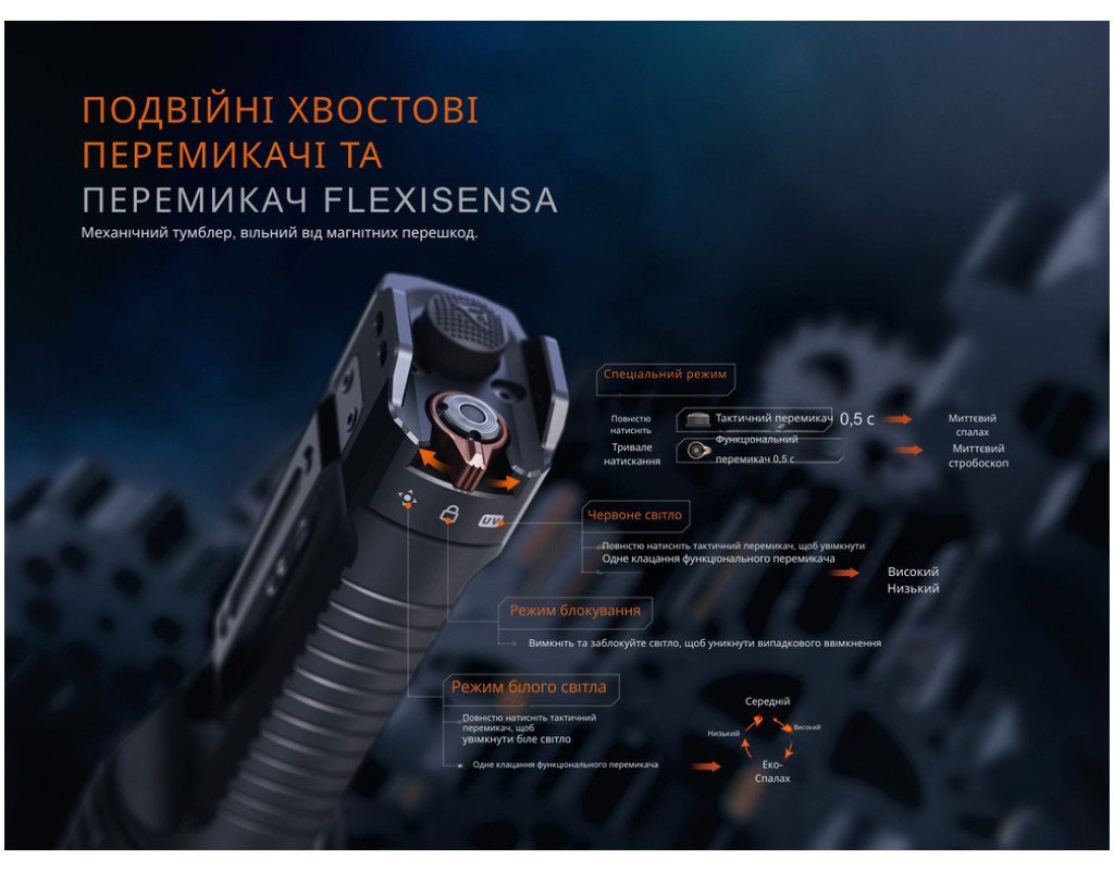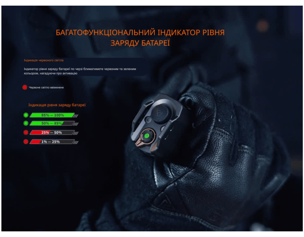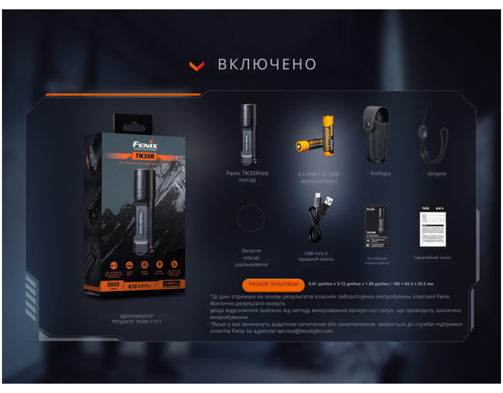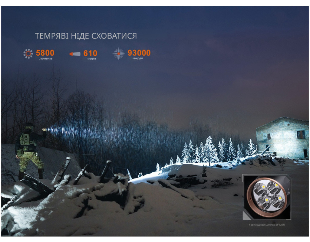 | Ліхтар Fenix TK35R з червоним світлом (TK35Rred) - бездоганний супутник у складних умовах, створений для тих, хто потребує яскравості, функціональності та надійності. Цей тактичний ліхтар призначений для патрулювань, пошуково-рятувальних операцій та інших завдань, що потребують потужного освітлення. Обладнаний п'ятьма світлодіодами з ресурсом роботи понад 50,000 годин, серед яких чотири Luminus SFT25R, що видають біле світло потужністю до 5800 люмен, та червоний Cree XEG, який забезпечує м'яке освітлення для збереження нічного зору. Температура білого світла становить 6500–7500 К, що сприяє контрастному та деталізованому освітленню при великих відстанях, досягаючи дальності променя до 610 м. Завдяки дев'яти режимам роботи, включаючи мінімальний, економ, середній, максимальний, стробоскоп, миготіння та спалахи, Fenix TK35R дозволяє адаптувати освітлення під різні потреби. Особливої уваги заслуговує червоне світло, яке є незамінним при підсвічуванні невеликих зон, наприклад, для читання карти в темряві. Червоний режим забезпечує до 260 люмен яскравості, що гарантує зручність у використанні за низької видимості. Ліхтар надійно живиться від двох Li-Ion акумуляторів 18650 загальною ємністю 8000 мА·год. Порт USB Type-C дозволяє швидке заряджання всього за 2 години, а індикатор стану акумулятора повідомляє про низький заряд. Корпус виконаний з анодованого алюмінію A6061-T6 та має високий клас захисту IP68, що робить його вологонепроникним та ударостійким. Fenix TK35R витримує короткочасне занурення у воду та падіння з висоти до 1 метра. Противоковзна накатка та тактичний хвіст забезпечують зручне утримання в будь-якій ситуації. Керування режимами ліхтаря здійснюється перемикачем FlexiSensa та двома хвостовими кнопками, що надають миттєвий доступ до режимів Спалах та Стробоскоп. Функція запам'ятовування останнього режиму робить використання Fenix TK35R ще зручнішим, а електронне блокування захищає від випадкового ввімкнення. Комплектація включає не лише сам ліхтар, але й два акумулятори Fenix ARB-L18-4000, кабель USB-C, запасне ущільнювальне кільце, темляк, чохол на пояс та посібник користувача. Це робить Fenix TK35R готовим до використання з моменту придбання. Обираючи Fenix TK35R, ви отримуєте універсальний інструмент для освітлення, який передбачає всі можливі сценарії використання завдяки своїм численним режимам, надійності та якості. Це ідеальний вибір для тих, хто цінує високотехнологічні рішення та відмінну продуктивність у будь-яких умовах. |