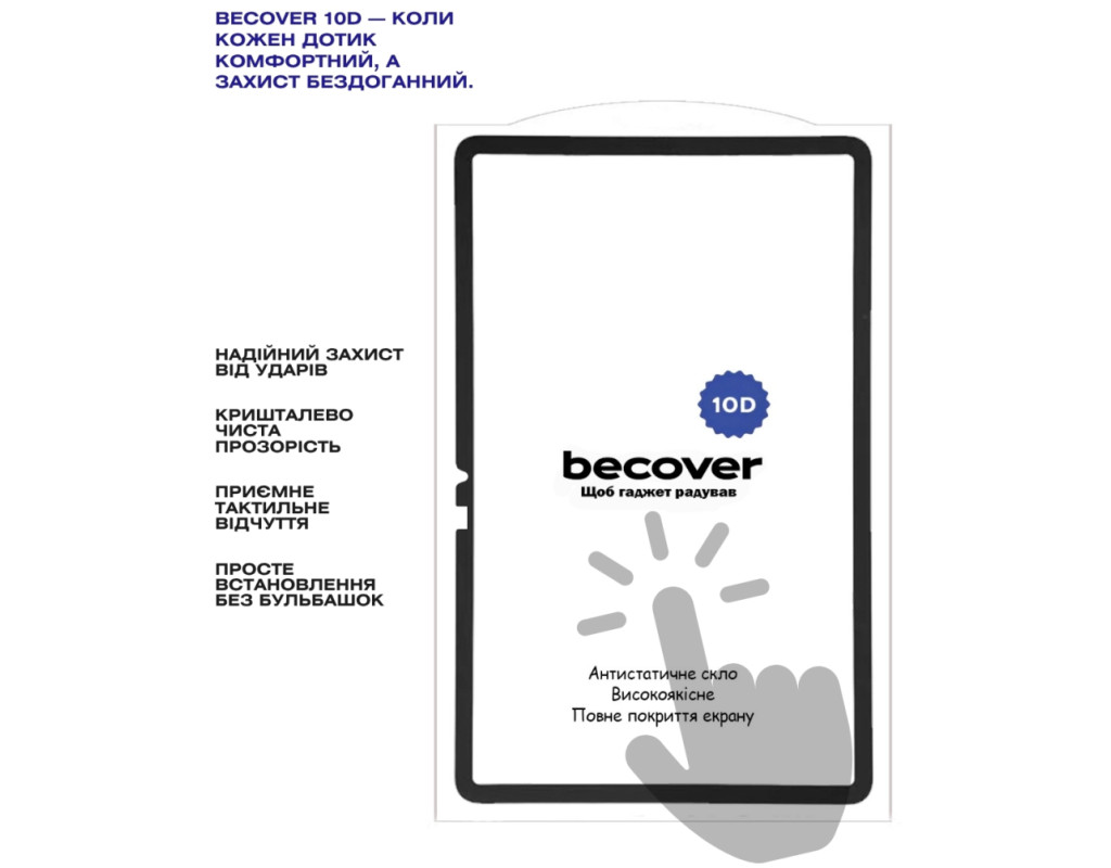 | "Відкрийте новий рівень захисту для вашого планшета з захисним склом 10D від ТМ BeCover! Наша передова технологія забезпечить повноцінний захист від подряпин, ударів та відбитків пальців, дозволяючи вашому пристрою залишатися завжди новим. Що робить наше захисне скло таким особливим? Воно не лише надійно захищає екран від пошкоджень, але і забезпечує кришталево чистий вигляд з високою прозорістю та точністю кольору. Технологія 10D дозволяє насолоджуватися кожним дотиком без будь-яких перешкод. Замовте захисне скло для планшета від ТМ BeCover прямо зараз та отримайте не тільки надійний захист, але й стильний аксесуар, який додасть вашому пристрою елегантність і сучасність. Оберіть найкраще для свого пристрою - оберіть захисне скло 10D від ТМ BeCover. Ваш планшет заслуговує тільки найкраще!" |