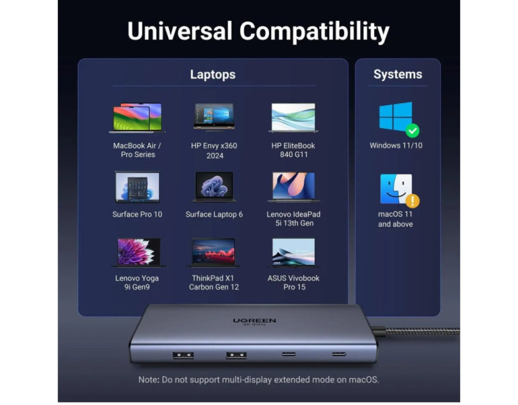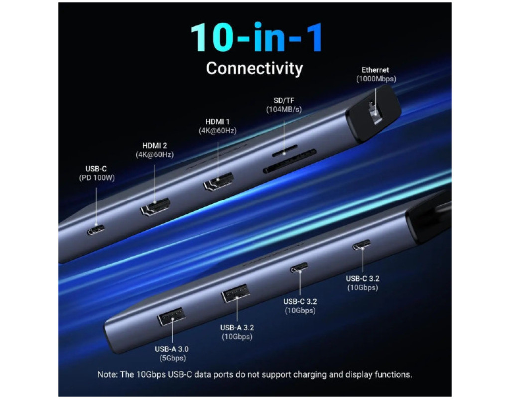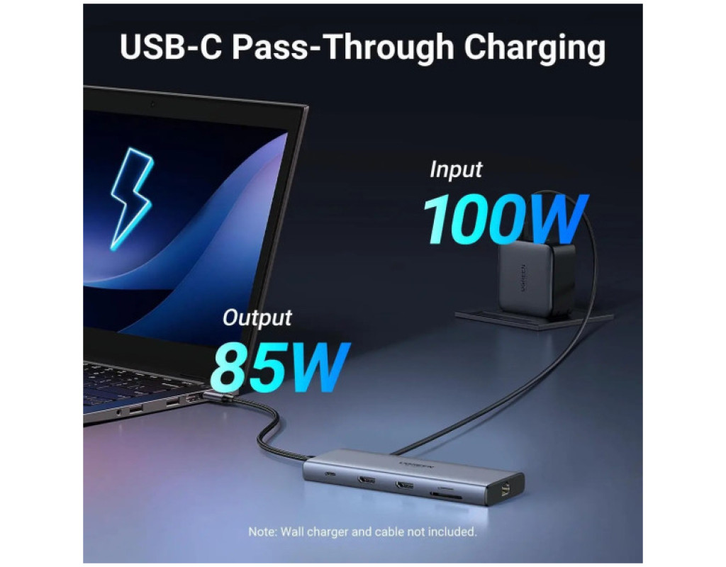 Порт-реплікатор Ugreen Dock CM639 USB3.2 Type-C --> HDMIx2, 60Hz/2xUSB-A/2xUSB-C 3.2/ RJ45/SD/TF/PD 100W (45380)