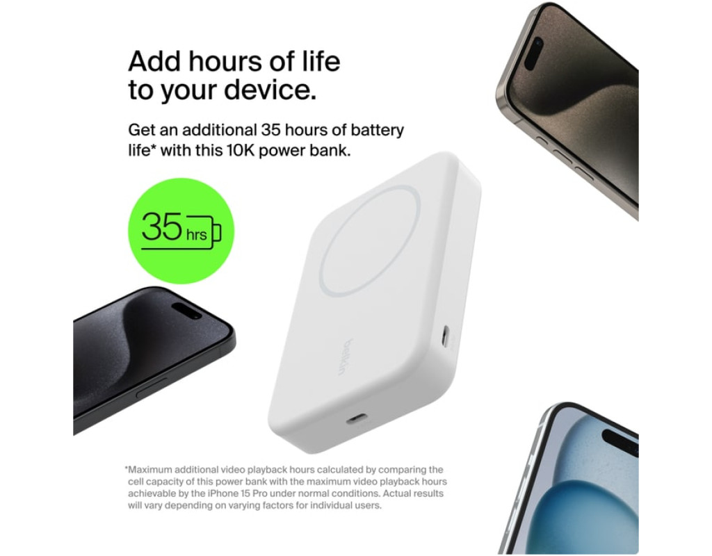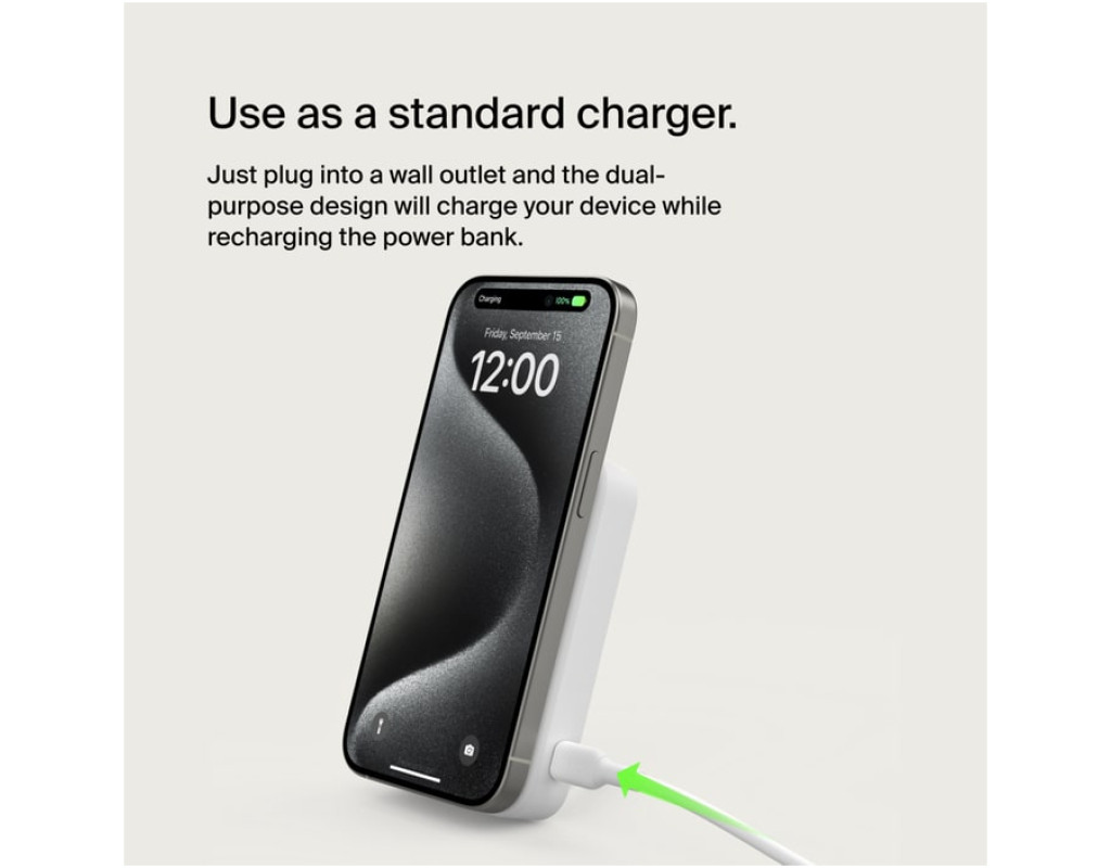 Бездротова зарядка для iPhone та пристроїв Qi2 Заряджайте iPhone та інші смартфони з підтримкою Qi2 швидко та безпечно за допомогою BoostCharge Pro Magnetic Power Bank з Qi2 15W 10K. Завдяки сумісності з MagSafe ваш пристрій отримує безперервне заряджання потужністю до 15 Вт. Вбудована підставка дозволяє комфортно переглядати відео, транслювати контент або знімати, навіть під час зарядки. Використовуйте зарядний пристрій як портативний зарядний пристрій, щоб насолоджуватися перевагами швидкого бездротового заряджання Qi2 з потужністю до 15 Вт для iPhone 15 та інших пристроїв з підтримкою Qi2. Отримайте додаткові 28 годин роботи від акумуляторної батареї на 8K. Відповідно до стандартів безпеки авіакомпаній TSA для душевного спокою під час польоту, бездротовий зарядний пристрій може перебувати з вами у вашій ручній поклажі. У комплекті кабель USB-C – USB-C, тому ви можете почати заряджати відразу. Незалежно від того, чи граєте ви в ігри, транслюєте або прокручуєте, магнітний зарядний пристрій утримує пристрій під ідеальним кутом для перегляду без затискання або кріплення, щоб закрити будь-яку частину екрана. Вбудована підставка дозволяє переглядати екран, доки ви продовжуєте переглядати веб-сторінки або приймати дзвінки. Основні особливості: