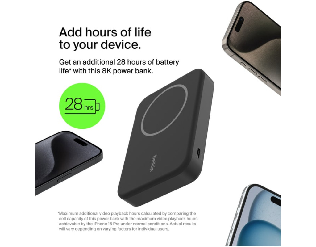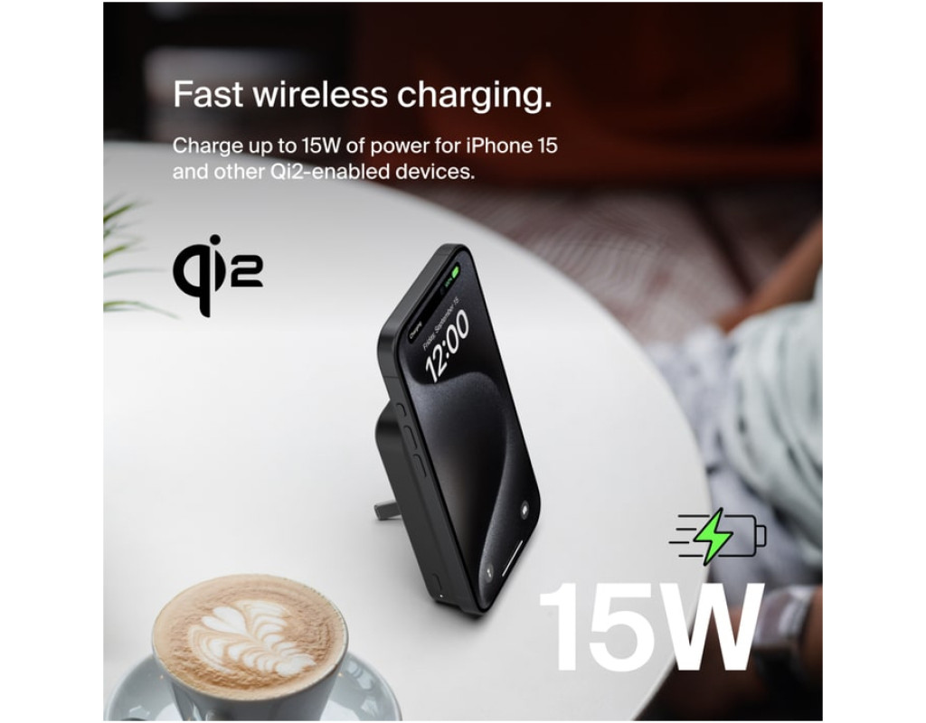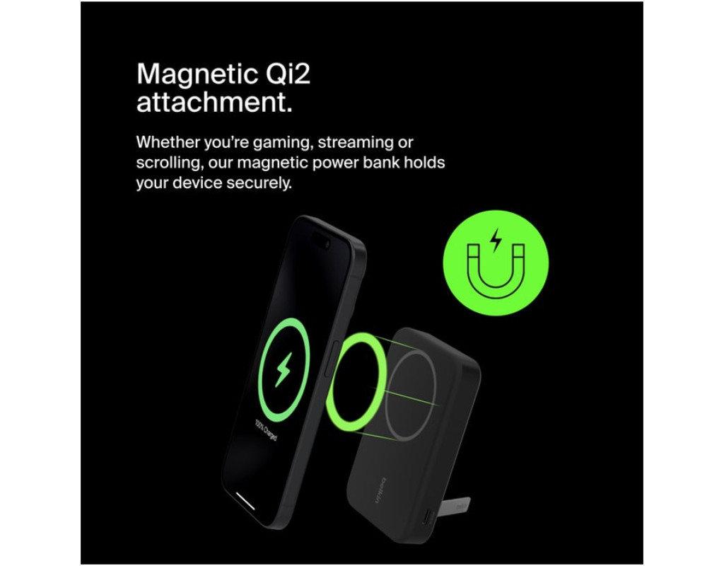 | Заряджайте iPhone та інші смартфони швидко та безпечно за допомогою цього попередньо зарядженого, готового до використання MagSafe павербанка. Пристрої з підтримкою Qi2 та MagSafe матимуть легке та безперешкодне заряджання до 15 Вт. Функція підставки дозволяє насолоджуватися переглядом відео та стрімінгом, поки пристрій заряджається. |