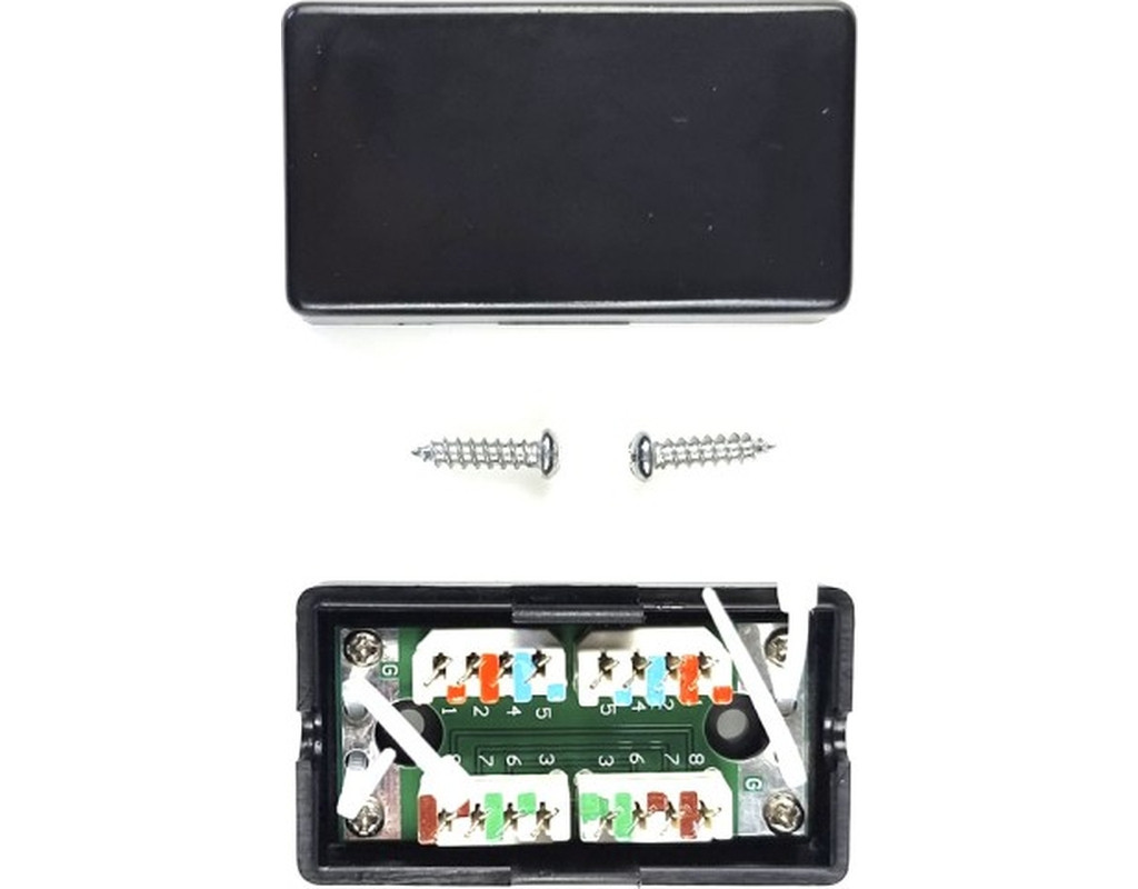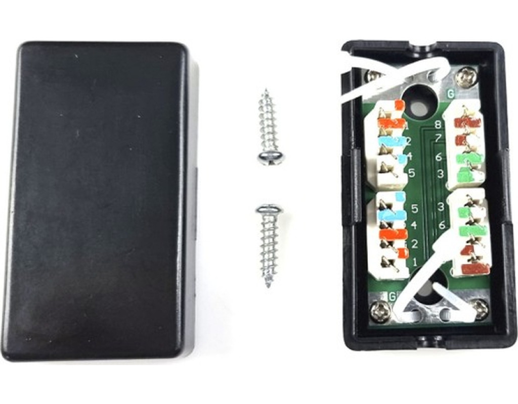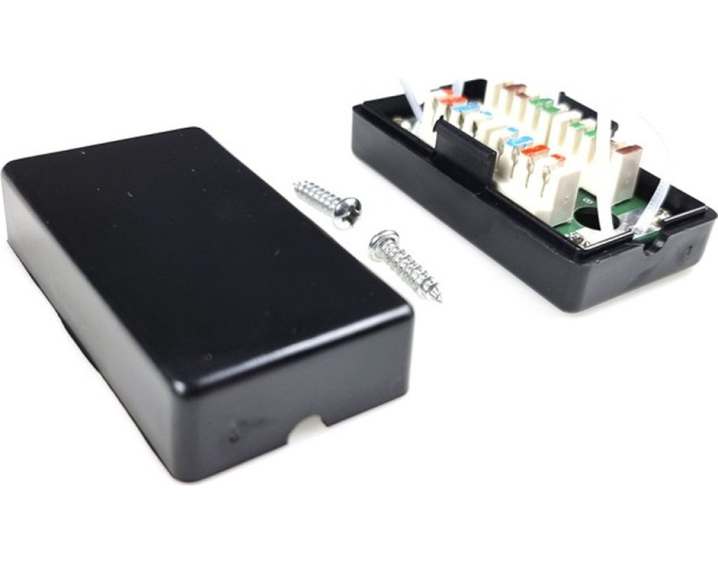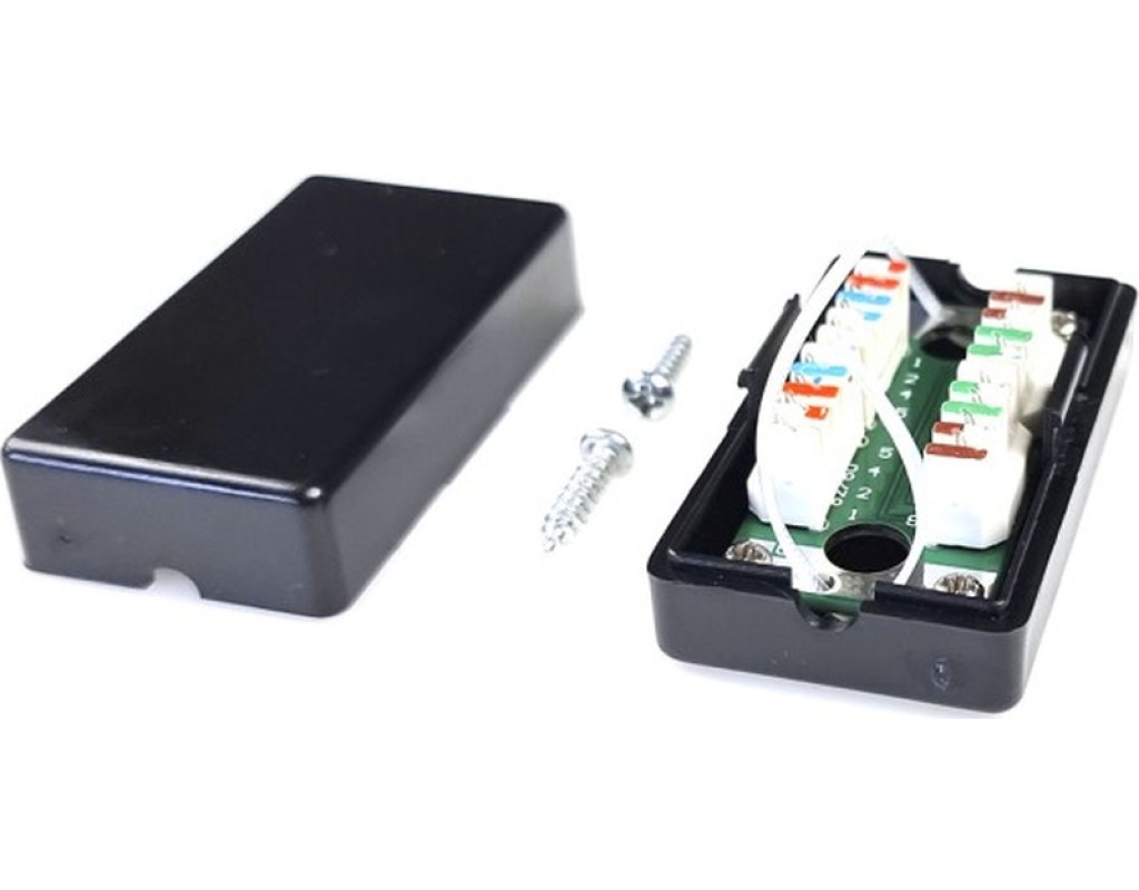 З'єднувальна розетка служить для з'єднання з мінімальним загасанням сигналу мідного кабелю категорії 5е. Являє собою пластмасову розбірну коробочку, всередині знаходяться місця для жил кабелів під «забивання». Кришка кріпиться на засувках. |