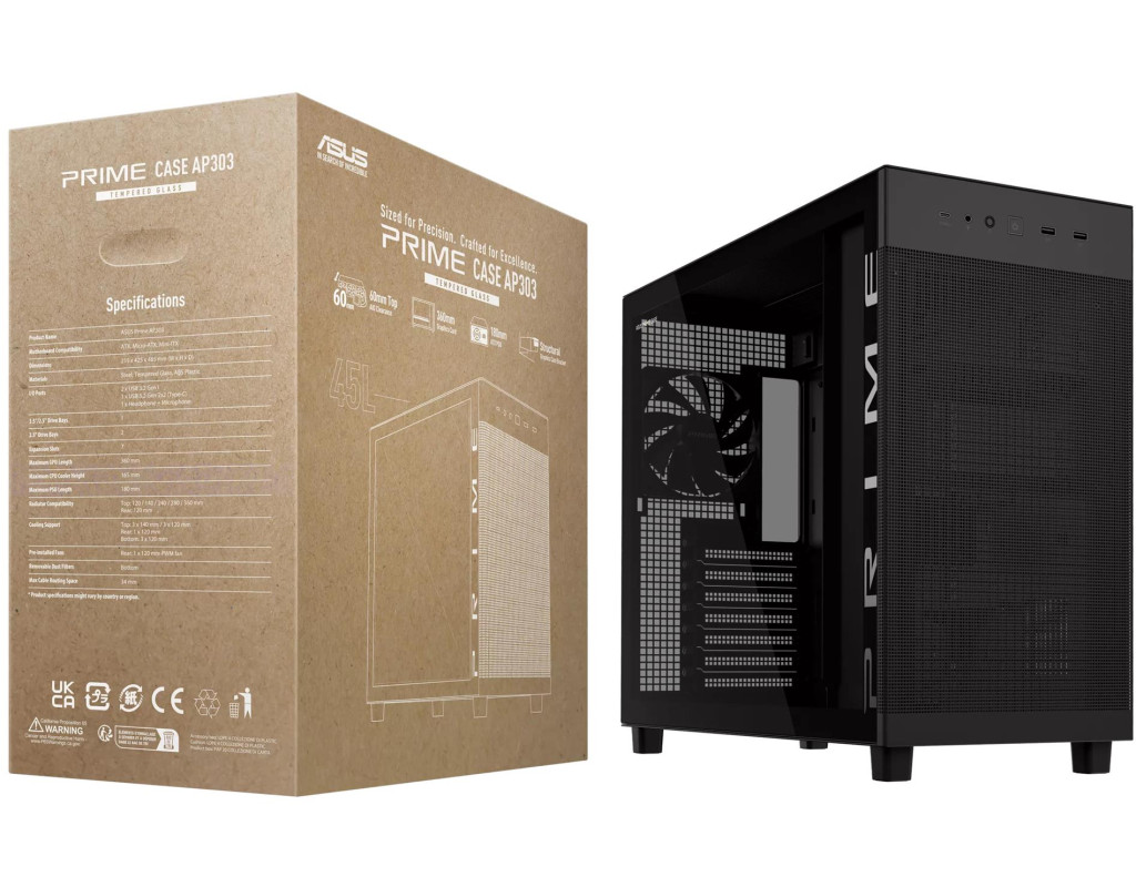 | Asus Prime AP303 - це компактний 44-літровий корпус ATX з підтримкою відеокарт довжиною до 360 мм, 360-мм радіаторів товщиною до 60 мм та блоків живлення ATX довжиною до 180 мм.