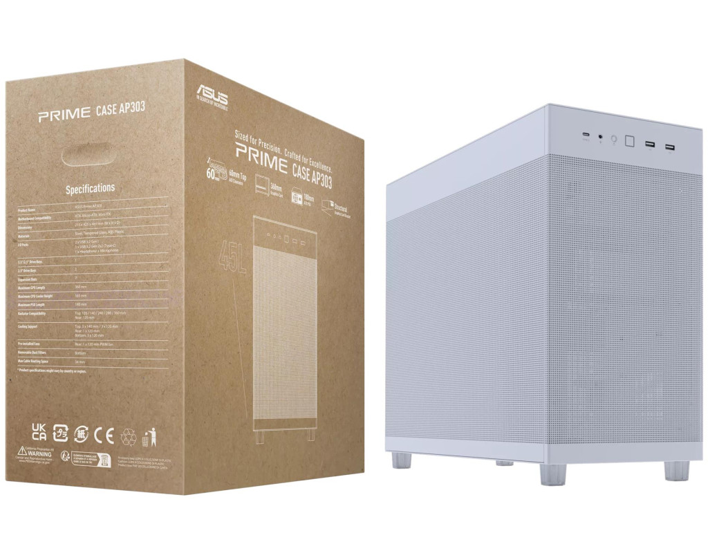 | Asus Prime AP303 - це компактний 44-літровий корпус ATX з підтримкою відеокарт довжиною до 360 мм, 360-мм радіаторів товщиною до 60 мм та блоків живлення ATX довжиною до 180 мм.