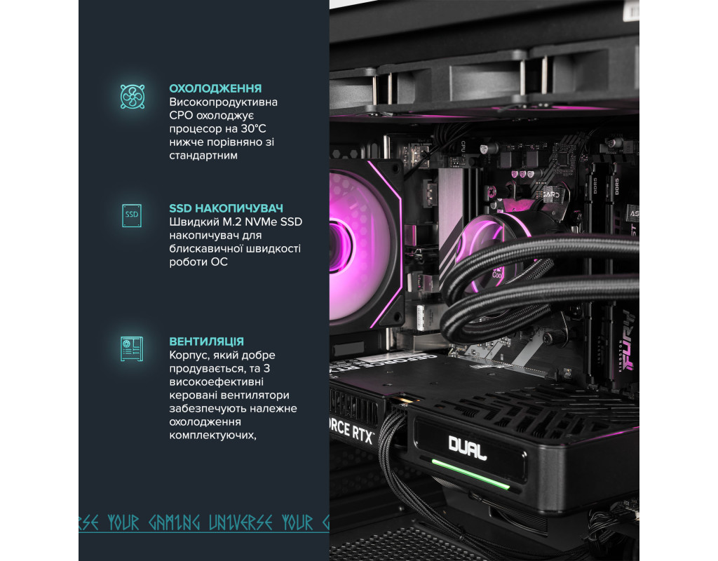 Геймер створює свій персоналізований, ігровий простір, де кожна деталь має особливе значення. Друк ваших улюблених героїв на корпусі, комплектуючі кращих виробників світу, безліч варіантів підсвітки - все це створить неймовірну атмосферу і ще більше занурить вас у світ гри.
