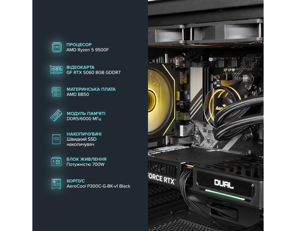 Персональний комп`ютер ASGARD (A95F.32.S20.56.6860); AMD Ryzen 5 9500F (3.8 - 5.0 ГГц) / ОЗУ 32 ГБ / SSD 2 ТБ / NVIDIA GeForce RTX 5060 8 ГБ / без ОП / LAN / без ОС / чорний