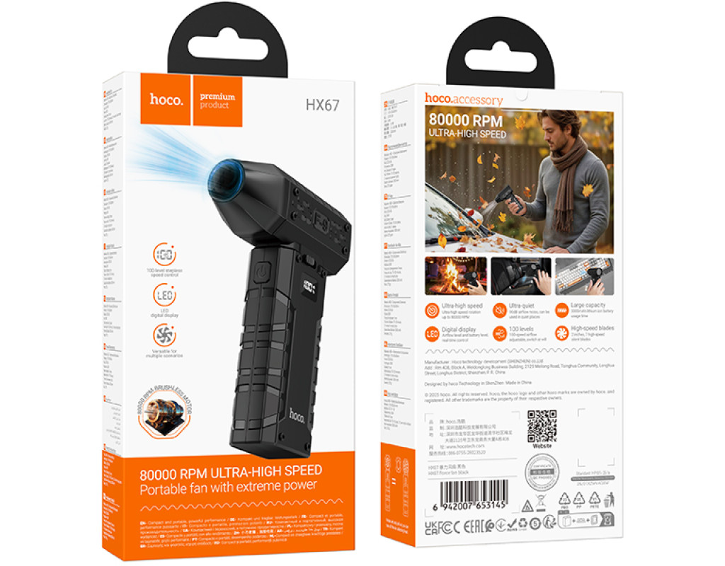 Ручний портативний компресор Hoco HX67, 80000RPM, 40m / s, 275г, Black, Box