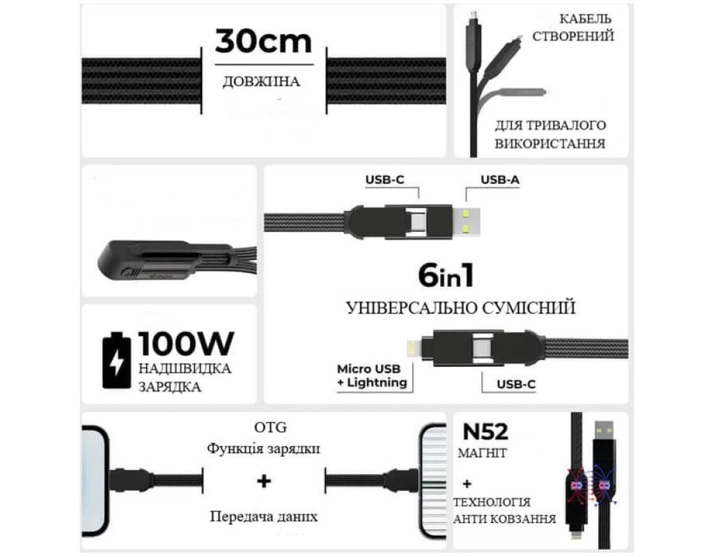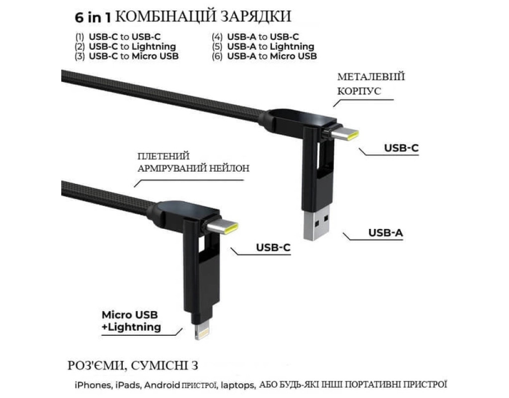 nCharge XL (6in1) — багатофункціональний кабель для зарядки та передачі даних, який завдяки 6-ти можливим комбінаціям з’єднань, замінює одразу кілька різних кабелів та підходить як для мобільного використання, так і для стаціонарної роботи з ноутбуками чи павербанками. Підтримує надшвидку зарядку до 100 Вт і зарядку пристроїв Apple до 27 Вт. Універсальне рішення для дому, офісу та подорожей — один кабель замість кількох. (модель доступна в асортименті: у 3-х кольорах — чорному, жовтому та білому, а також у варіантах довжини 3 м, 2 м і 30 см) Особливості: • 6 в 1 — підтримує всі популярні типи з’єднань: USB-A → USB-C; USB-A → Lightning; USB-A → Micro USB; USB-C → USB-C; USB-C → Lightning; USB-C → Micro USB • потужність зарядки до 100 Вт — підходить для заряджання ноутбуків • швидкість передачі даних: 480 Мбіт/с / 60 Мбіт/с • плетена оплітка — забезпечує довговічність і стійкість до зламів • алюмінієві конектори - преміальна якість збірки • довжина 30 см — компактний та портативний варіант для щоденних потреб • сумісність: Phone, iPad, AirPods; Android; ноутбуки, планшети; пристрої з USB-C; пристрої з Micro USB • матеріали: металевий корпус; 200 мідних проводів в обплетенні; магніти N52; армований TPU кабель; нейлонове армування; арамідне волокно Рекомендації щодо використання та догляду: • уникайте надмірного згинання кабелю під гострим кутом, особливо біля роз’ємів — це подовжить термін служби • не піддавайте кабель впливу вологи, прямих сонячних променів чи високих температур • для очищення достатньо протерти кабель м’якою сухою або злегка вологою тканиною; не використовуйте агресивні хімічні засоби • регулярно перевіряйте цілісність оплітки та роз’ємів, щоб уникнути короткого замикання • не використовуйте кабель із пошкодженими конекторами чи у разі поміченого перегріву • гарантія не поширюється на пошкодження, що не є заводським браком, а також на наслідки перегріву чи неправильного використання |