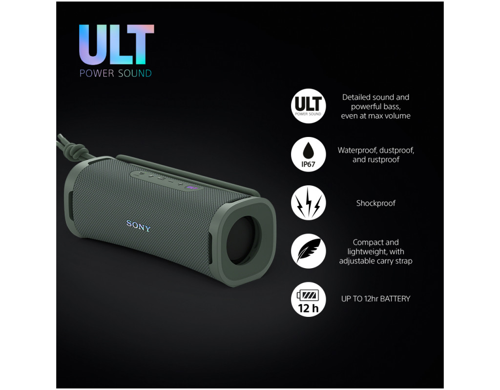 | Портативна акустична система Sony ULT FIELD 1 забезпечує потужне звучання з насиченими басами у компактному корпусі. Завдяки кнопці ULT активується режим глибоких низьких частот, а процесор Sound Diffusion Processor розширює звуковий простір. Колонка має захист від води, пилу та ударів за стандартом IP67, що робить її стійкою до зовнішніх умов. До 12 годин автономної роботи гарантують тривале звучання без підзарядки. |