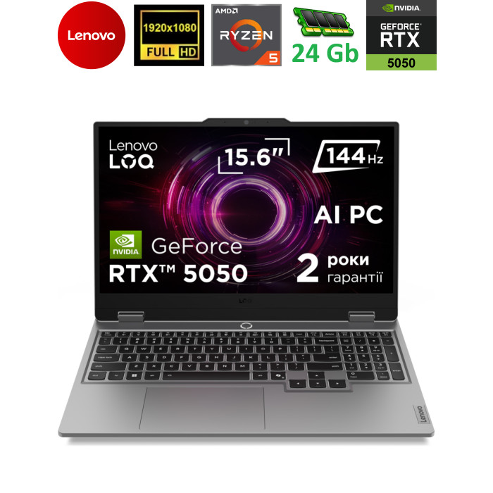 Портал у світ кольору, швидкості й потужності Ключова перевага — дисплей. 15,6-дюймовий Full HD IPS-екран із частотою оновлення кадрів 144 Hz, яскравістю 300 ніт і передачею кольорів 100% sRGB захоплює деталізацією й ідеально підходить як для змагальних ігор, так і для роботи з відео чи фото. Технологія G-SYNC гарантує плавність зображення без розривів кадрів. Відеокарта NVIDIA GeForce RTX 5050 з 8 ГБ пам’яті забезпечує ігровий досвід високого рівня. Технології DLSS 4 і трасування променів роблять графіку максимально реалістичною, а продуктивність залишається на висоті навіть у вимогливих іграх. Lenovo LOQ 15AHP10 Luna Grey оснащений оперативною пам’яттю типу DDR5-5600, обсягом 24 ГБ. Зберігати дані — легко, адже ноутбук комплектується швидким SSD-накопичувачем обсягом 512 ГБ типу M.2. Висока швидкість передачі даних забезпечує блискавичну відповідь системи в усіх сценаріях користування, будь то ігри, стрім чи обробка контенту.