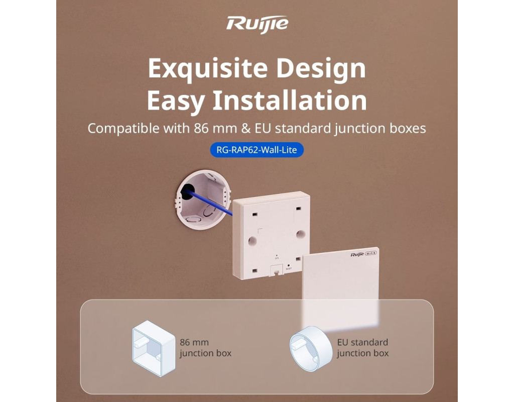 Швидкості Wi-Fi 6 AX3000: максимальна 2401 Мбіт/с у діапазоні 5 ГГц + максимальна 573 Мбіт/с у діапазоні 2,4 ГГц Сумісність із розподільними коробками 86 мм та стандарту ЄС Вписується в інтер’єр приміщення Декоративна конструкція з сегментами по товщині: частина на стіні, що виступає, складає всього 24,8 мм (0,98 дюйма) Централізоване керування через Ruijie Cloud |