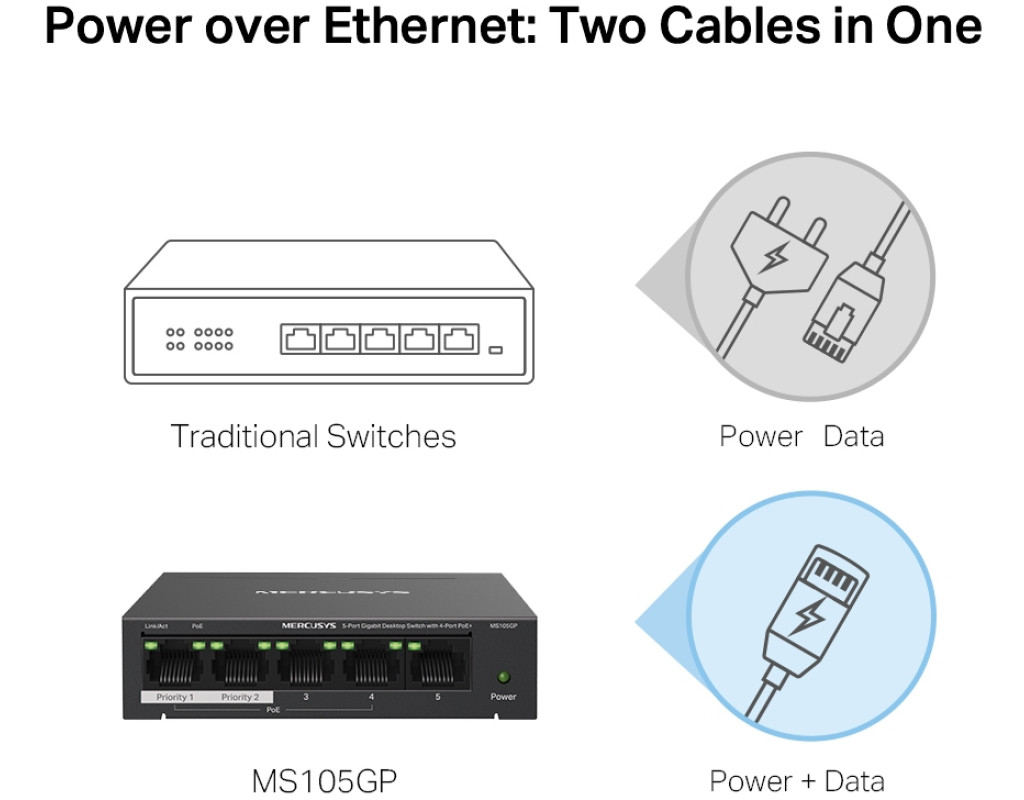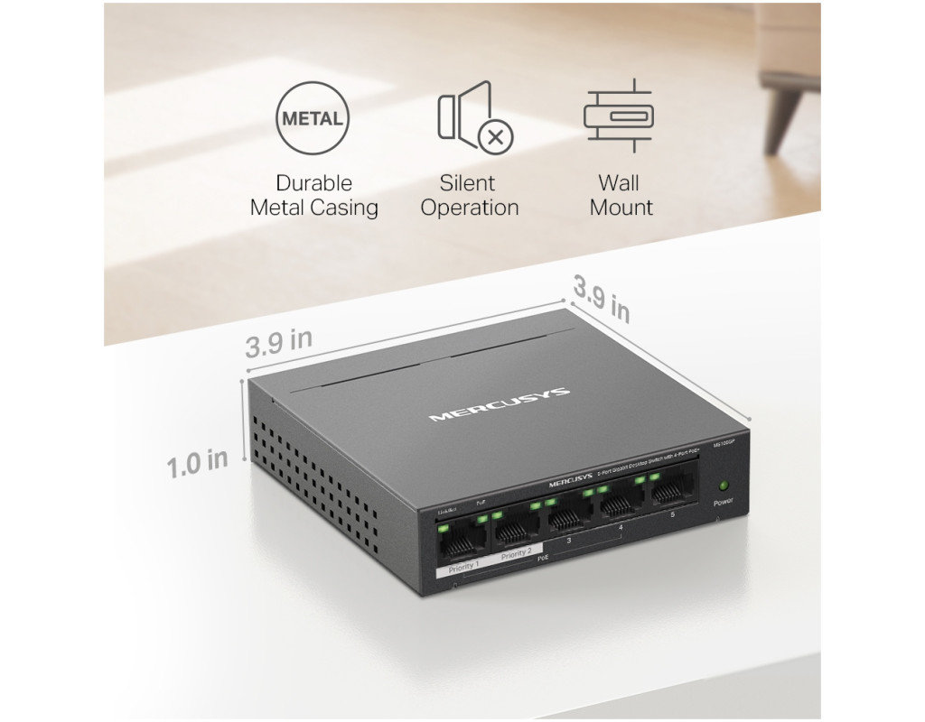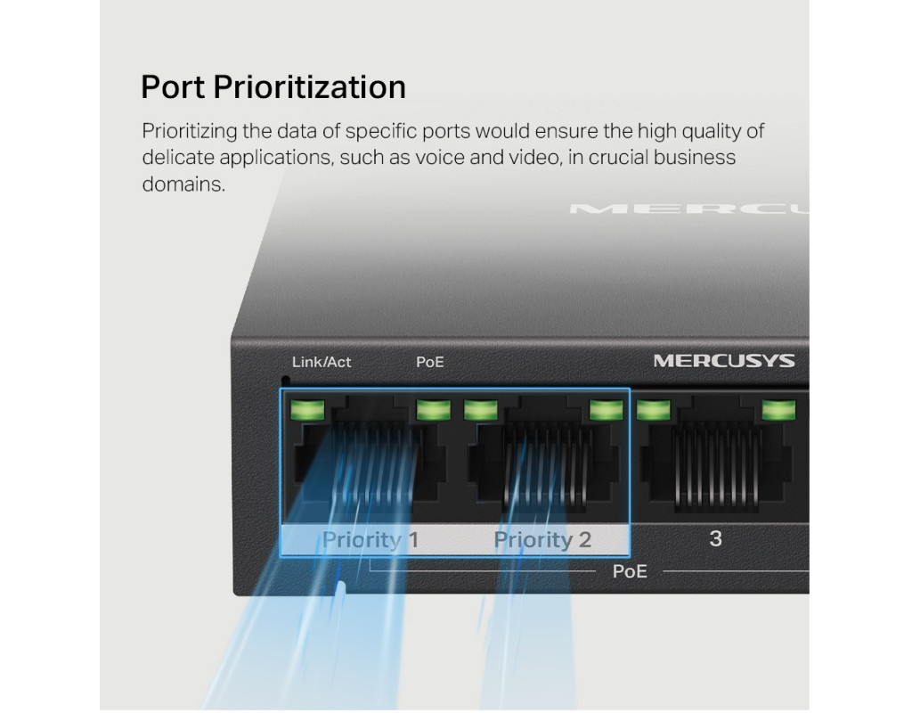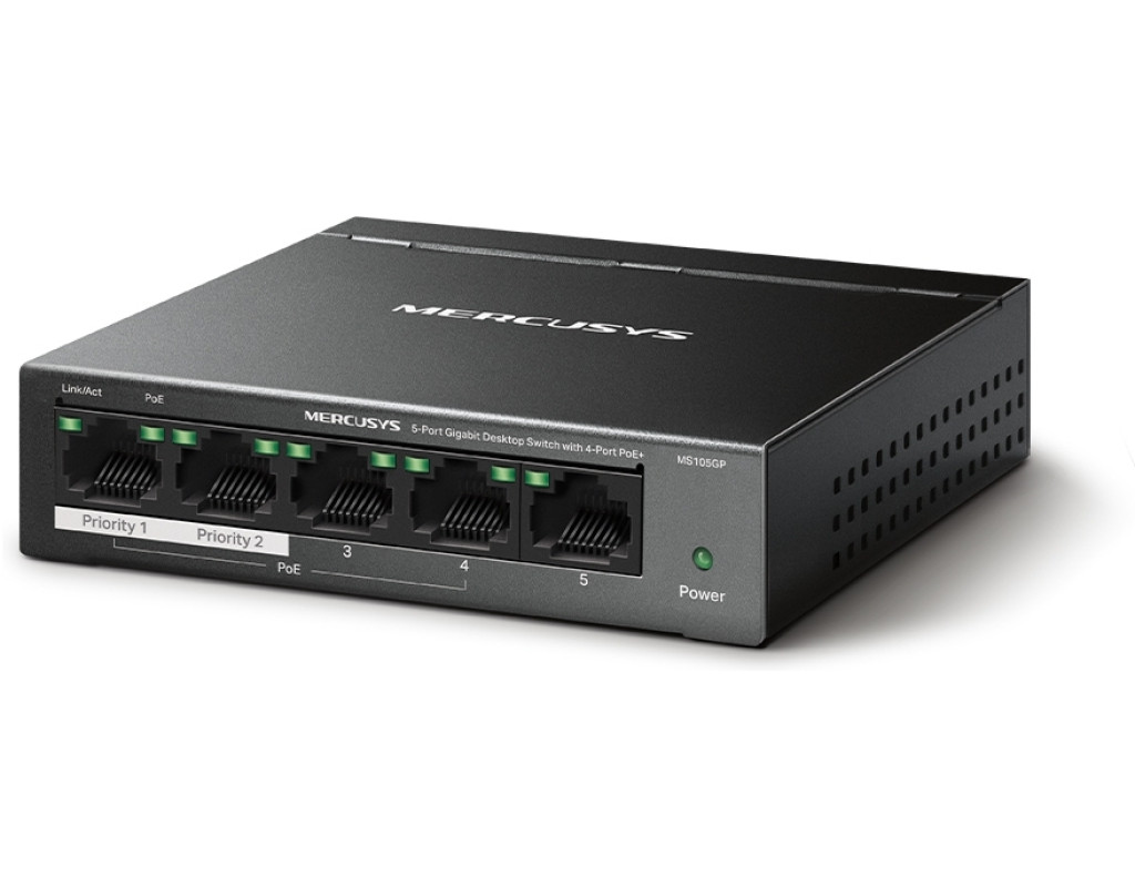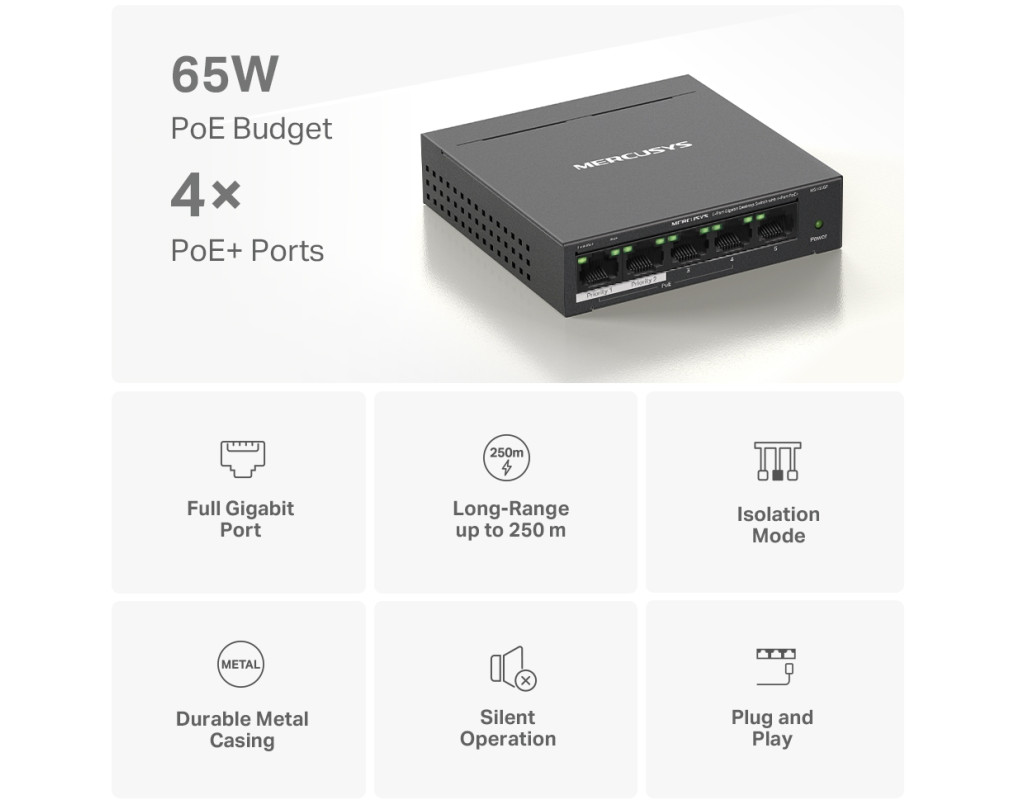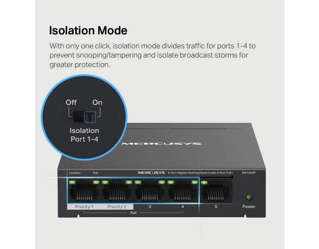 4 порти PoE+ (бюджет 65 Вт) для розгортання мережі Всі п'ять портів MS105GP є гігабітними, з чотирма портами PoE+ (1-4). Кожен порт PoE+ підтримує максимум 30 Вт і сумісний з пристроями з живленням від 802.3af/at. Загальний бюджет PoE потужністю 65 Вт для 4× портів PoE+ забезпечує різноманітні варіанти використання, включаючи відеоспостереження в офісах, гуртожитках і малому бізнесі. IP-камери, точки доступу, IP-телефони, ПК, відеореєстратори та багато іншого повністю сумісні з ним. Дальність роботи до 250 м з розширеним режимом Розширений режим збільшує відстань передачі PoE до 250 м. MS105GP має чотири порти дальнього радіусу дії з PoE+. Увімкніть розширений режим і зробіть його ідеальним для встановлення камер спостереження на широких територіях. Поділ трафіку Режим ізоляції лише одним клацанням миші розділяє трафік для портів 1–4, щоб запобігти шпигунству/несанкціонованому доступу та ізолювати широкомовні шторми для кращого захисту. Пріоритезація портів Пріоритезація даних конкретних портів забезпечить високу якість делікатних додатків, таких як голос і відео, у найважливіших бізнес-доменах. Plug&Play MS105GP пропонує автоузгодження (10/100/1000 M) та автоматизований MDI/MDIX. Додаткове налаштування не потрібне. Він простий у використанні та економить час та сили. Міцний і безшумний Міцний металевий корпус MS105GP забезпечує ефективне розсіювання тепла, відмінний захист від перешкод сигналу, стабільність обладнання та тривалий термін служби мережі. |