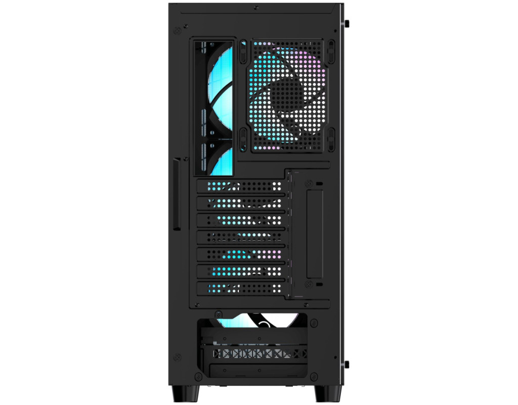 В основі корпусу — високопродуктивний повітряний канал, що забезпечує оптимальний розподіл потоків. Передня панель зі збільшеною вентиляційною зоною пропускає значно більше повітря, створюючи інтенсивну циркуляцію навколо ключових компонентів. У комплекті передбачено чотири ARGB-вентилятори, що разом із правильним розташуванням повітряних прорізів посилюють охолоджувальні можливості й допомагають системі працювати стабільно навіть під максимальним навантаженням.