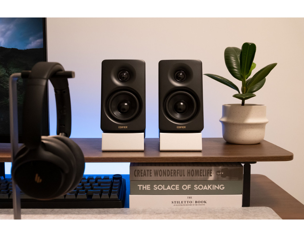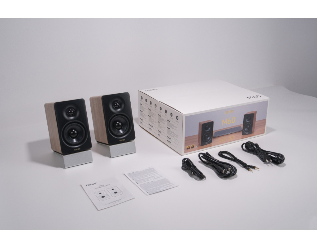 Стильні та потужні Edifier M60 — це компактні настільні колонки, створені для відтворення високоякісного аудіо у форматі Hi-Res. Поєднання потужності та елегантного дизайну робить їх ідеальним доповненням до будь-якого робочого чи ігрового простору. Потужне звучання Кожен корпус із дерева містить твітер із шовковим куполом (1") та 3" динамік середніх і низьких частот з алюмінієвою діафрагмою. Завдяки високоефективному підсилювачу класу D від Texas Instruments колонки забезпечують сумарну потужність 66 Вт RMS, даруючи чисте та насичене звучання. Високоточна обробка аудіо Колонки обладнані високопродуктивним аналоговим аудіотрактом та підсилювачем класу D від Texas Instruments із роботою у форматі 24-біт/96 кГц, що гарантує точне перетворення сигналу. Вбудований DSP забезпечує коректну роботу двосмугового активного кросовера та ефективний динамічний контроль діапазону (DRC). Універсальність підключення На задній панелі розташовані входи USB-C та AUX, що дозволяють легко підключати комп’ютер або програвач вінілових платівок. Сучасний Bluetooth Аудіоприймач Bluetooth 5.3 підтримує кодек LDAC із максимальною швидкістю передавання до 990 кбіт/с. Ви можете транслювати Hi-Res Audio у форматі до 24-біт/96 кГц з Android-пристроїв, починаючи з версії 8.0. Зручне керування На верхній частині колонки розташована сенсорна панель з автоматичним підсвічуванням, яка активується при наближенні руки та гасне самостійно. Простими дотиками й свайпами можна швидко керувати відтворенням. Підставки у комплекті У комплект входить пара фірмових алюмінієвих підставок. Вони мінімізують забарвлення звуку, викликане відбиттям від поверхні столу. Конструкція із нахилом 15° спрямовує звук точно на рівень вух для максимальної чіткості під час прослуховування. Застосунок EDIFIER ConneX Завантажте мобільний застосунок EDIFIER ConneX, щоб отримати доступ до додаткових функцій: