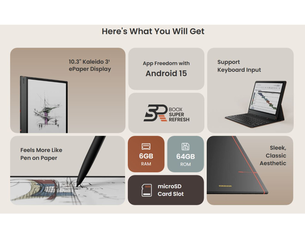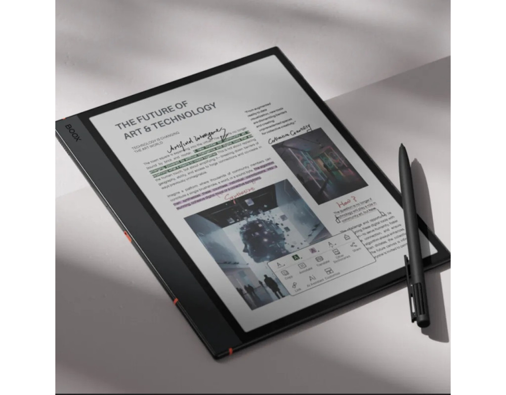 Легко підключайтеся до легкої продуктивності Завдяки потужному восьмиядерному процесору та 6 ГБ оперативної пам’яті Note Air 5 C легко справляється з професійними завданнями. Багатозадачність, проекти будь-якого розміру та проста офісна робота виконується з високою ефективністю. Завдяки технології BOOX Super Refresh кожен рух пальцем або прокручування виконуються миттєво. Зафіксуйте все без обмежень Будь-яка ідея знайде своє втілення на Note Air 5 C - гнучкому планшеті для творчих ідей, наукових нотаток та всього іншого. Це як писати ручкою на папері, тільки краще – з новим стілусом Pen 3 та передовими інструментами для створення нотаток. Візуальний стиль Перетворіть розрізнені нотатки на впорядковану систему за допомогою універсальних інструментів для організації. Використовуйте «Контури» для чіткої структури нотаток, інструмент «Посилання» для об’єднання пов’язаних пунктів та «Теги» для категоризації ідей. Це ідеальний інструмент як для навчання, так і для роботи. Ваші ескізи Малюйте, розфарбовуйте та створюйте бездоганні роботи у творчому просторі, де ідеї набудуть форми. Завдяки широкому набору інтелектуальних інструментів дизайнери та ілюстратори легко зможуть створити шедевр. Зручно та просто Розвивайте свої ідеї вільно та розширюйте за допомогою Infinite Notes. Насолоджуйтесь необмеженим простором для створення всього, що Вашій уяві хочеться. Висловлюйте свої думки по-своєму Вивчіть різноманітні інструменти для письма, які допоможуть вам легко розвивати ідеї та розширити можливості творчого процесу. Пориньте у світ контенту Вибирайте з різних тем читання або налаштуйте власну для більшої ефективності. Доступно як для електронних книг з можливістю перекомпонування, так і для PDF-форматів, забезпечуючи ідеальний ритм кожної сторінки відповідно до вашого улюбленого стилю читання. Все для навчання Перетворіть читання на знання, виділяючи текст та анотуючи його. Завдяки підтримці різних форматів, ви можете писати практично в будь-якому документі, щоб зафіксувати результати. Для будь-яких завдань Полегшіть розуміння складних матеріалів за допомогою помічника на основі штучного інтелекту, який допоможе розібрати складну термінологію, інтерпретувати складні пропозиції та генерувати швидкі пояснення. Повна підтримка програм Завдяки доступу до магазину Google Play та підтримці карт microSD об’ємом до 2 ТБ ви можете завантажити всі необхідні програми для роботи. BOOX EinkWise Миттєво використовуйте оптимальну тему оформлення для різних програм та завдань. Режим оновлення, колірний режим та макет можна налаштувати відповідно до ваших потреб. Інтерфейс користувача в стилі планшета Персоналізуйте свій домашній екран за допомогою настроюваних віджетів, групуйте програми за завданнями або проектами та розміщуйте їх у зручному для вас форматі для швидкого доступу. Максимальна ефективність із розділеним екраном Розділіть екран на дві частини щоб домогтися більшого. Чи порівнюєте ви важливі дані або робите нотатки під час читання все це стає набагато зручніше з розділеним екраном. Повна синхронізація Синхронізуйте свої блокноти та вихідні файли книг разом з усіма виділеними фрагментами та анотаціями з OnyxCloud для зручності пошуку та миттєво переносіть файли між Note Air 5 C, телефоном та ПК за допомогою BOOXDrop. |